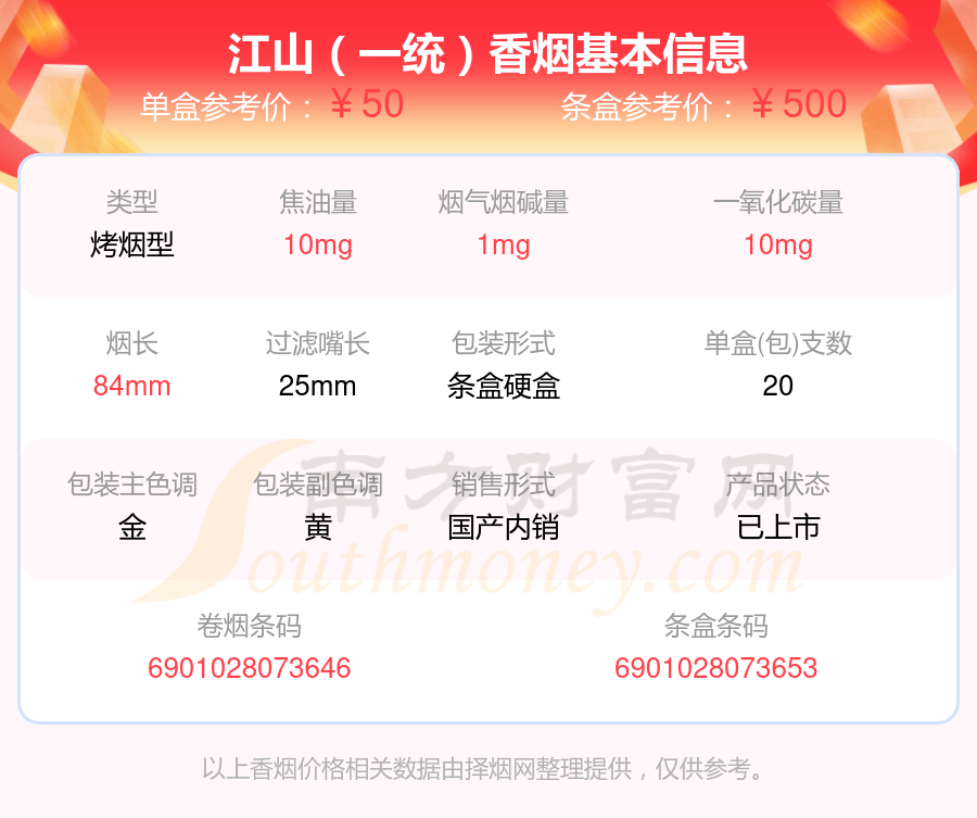 江山(珍品)參考價(jià)15元/包、江山(精品)參考價(jià)7元/包、江山(聽裝)參考價(jià)15元/包、江山(一統(tǒng))參考價(jià)50元/包等。