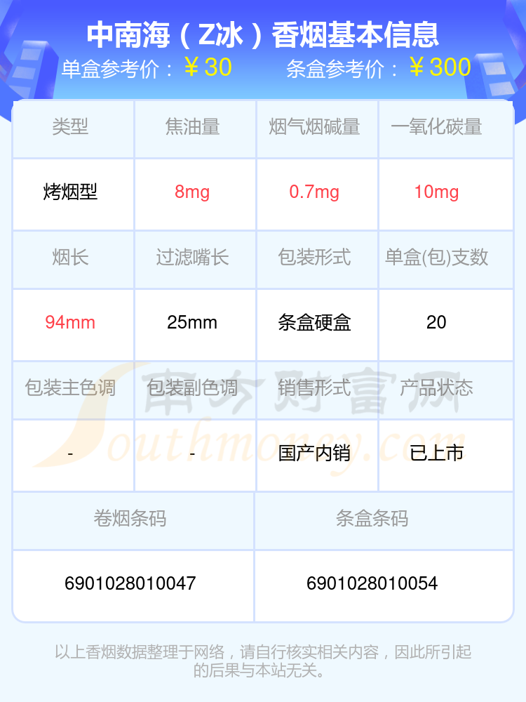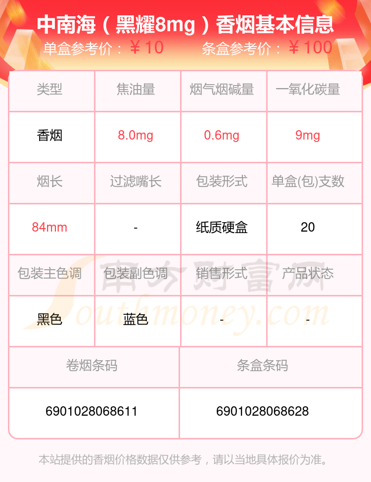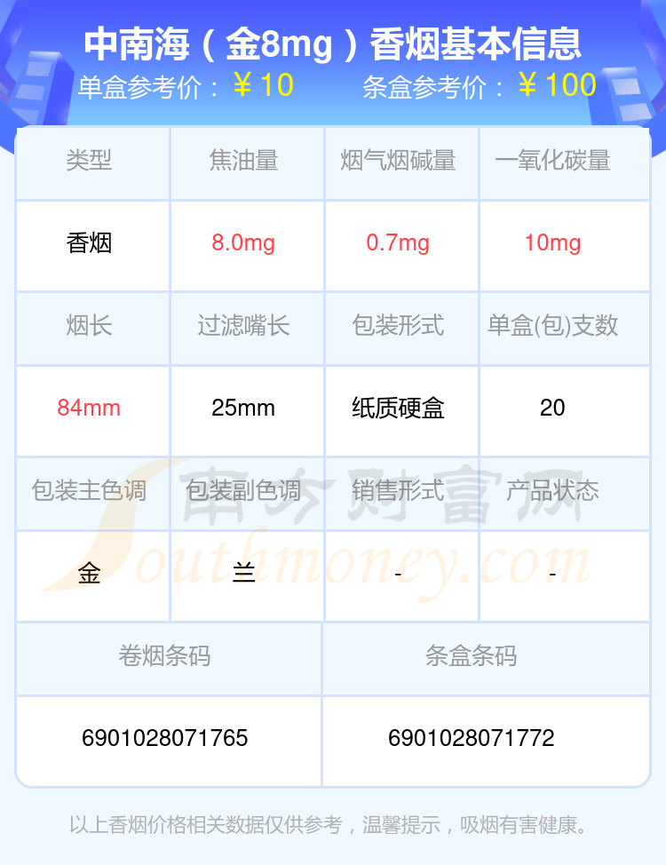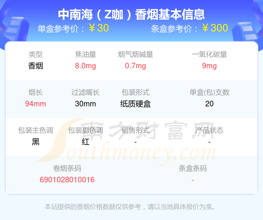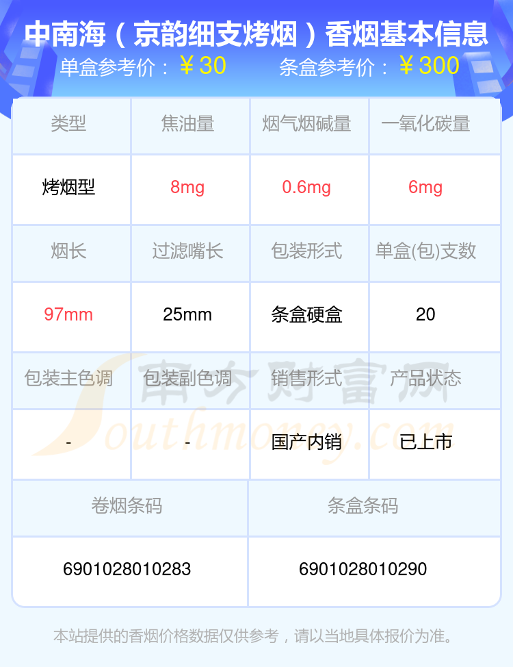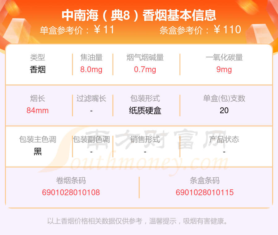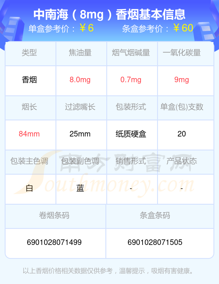 中南海(8mg上海日上)參考價6.0元/包、中南海(典8)參考價11.0元/包、中南海(金8mg)參考價10.0元/包、中南海(8mg香港南洋)參考價4.0元/包、中南海(8mg)參考價6.0元/包、中南海(酷爽風尚)參考價18.0元/包、中南海(Z咖)參考價30.0元/包、中南海(黑耀8mg)參考價10.0元/包、中南海(Z冰)參考價30元/包、中南海(京韻細支烤煙)參考價30元/包等。