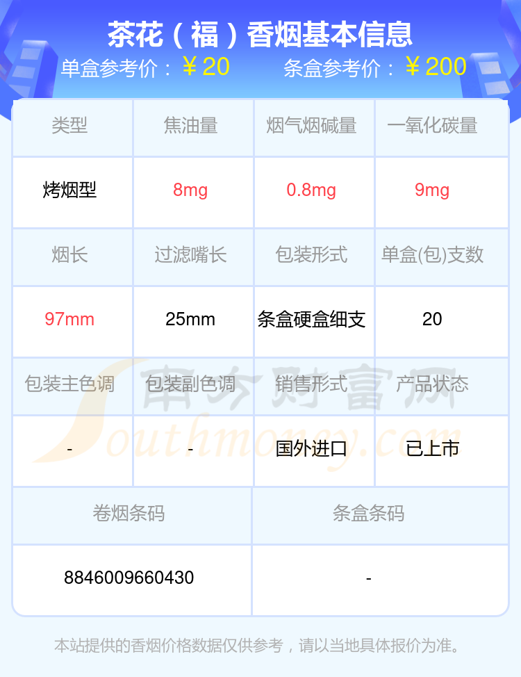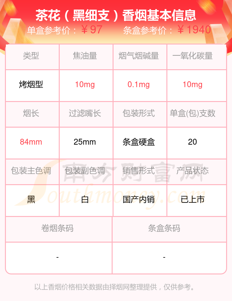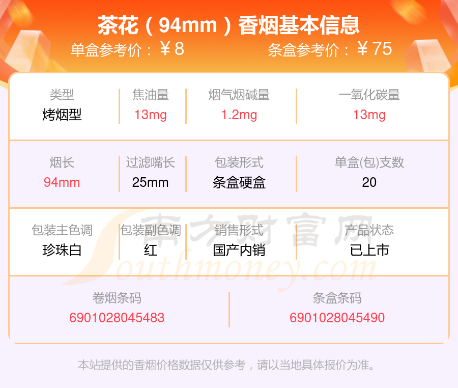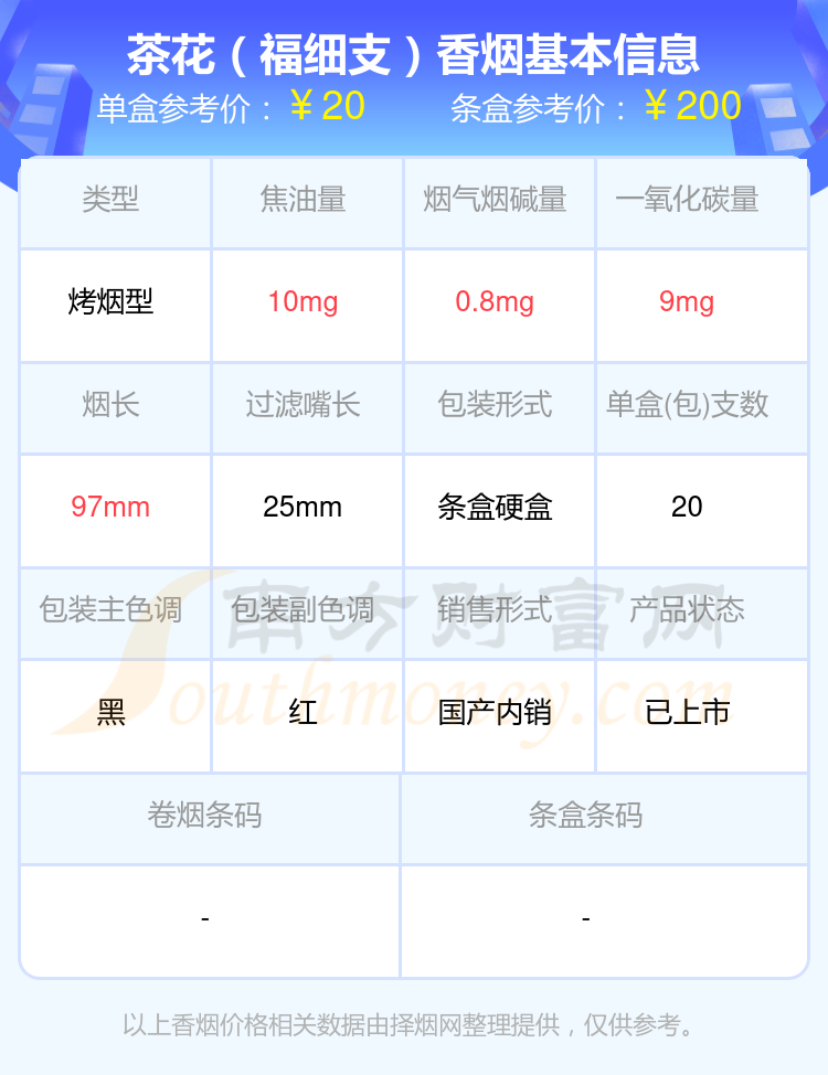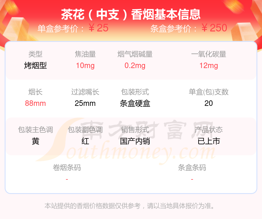 茶花(94mm)參考價8元/包、茶花(福)參考價20元/包、茶花(福細支)參考價20元/包、茶花(中支)參考價25元/包、茶花(黑細支)參考價97元/包等。