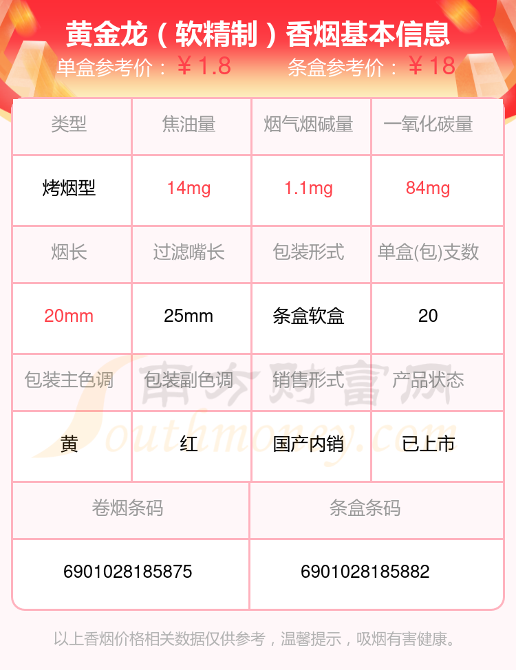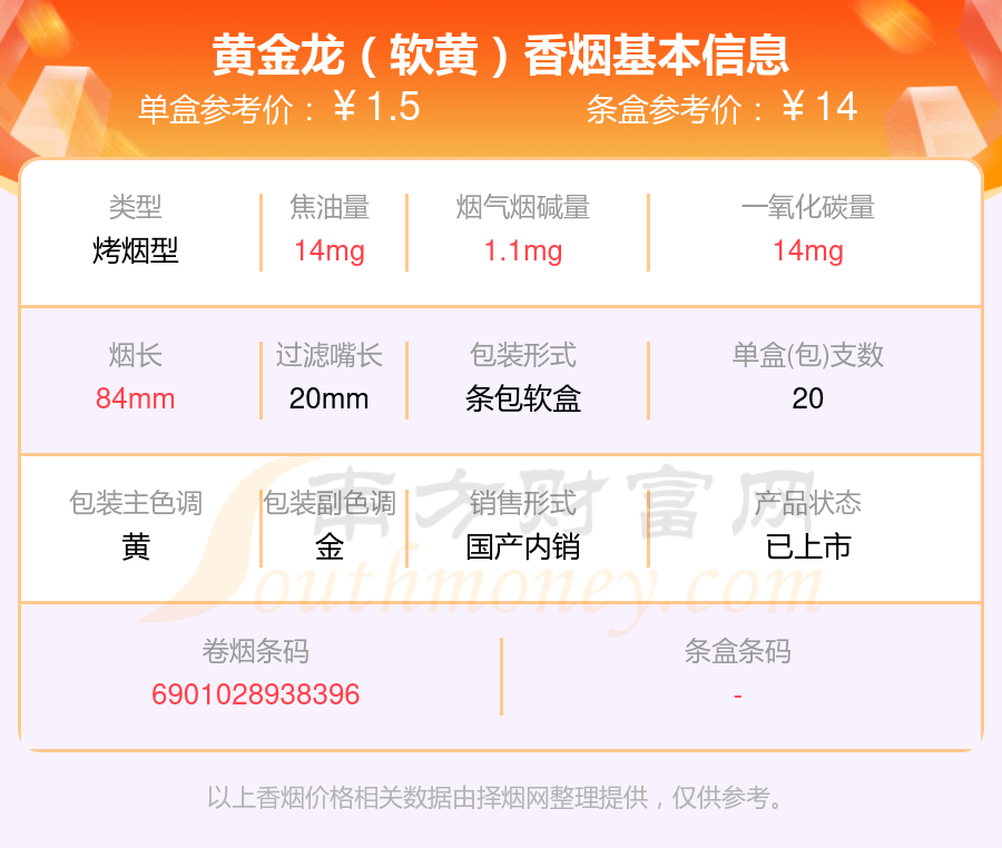 黃金龍(軟黃)參考價(jià)1.5元/包、黃金龍(硬)參考價(jià)3元/包、黃金龍(軟精制)參考價(jià)1.8元/包等。