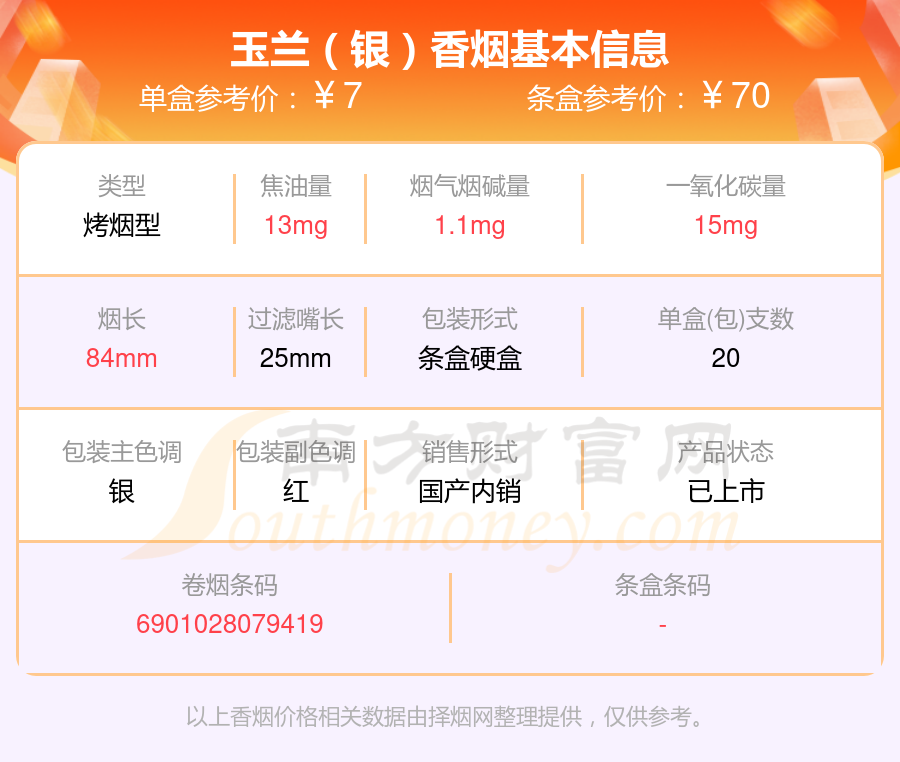 玉蘭香煙尼古丁低于2mg的煙有玉蘭(金2代)、玉蘭(銀)、玉蘭(軟)等,具體價格如下: