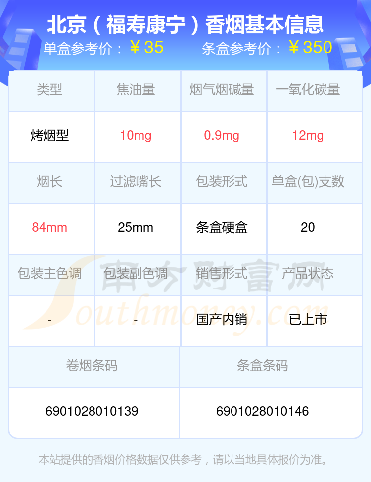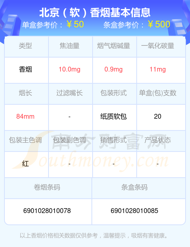 北京香煙20~60元的煙有哪些?擇煙網(wǎng)為大家整理提供,分別有:北京(軟)、北京(紅)、北京(軟紅)、北京(福壽康寧)、北京(硬)等,具體價格如下: