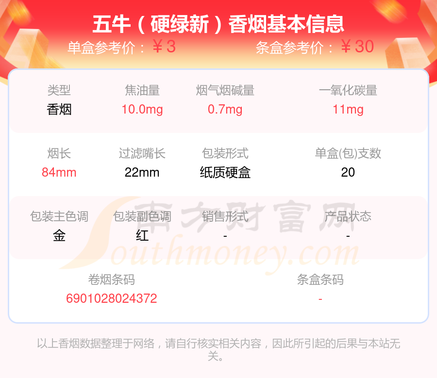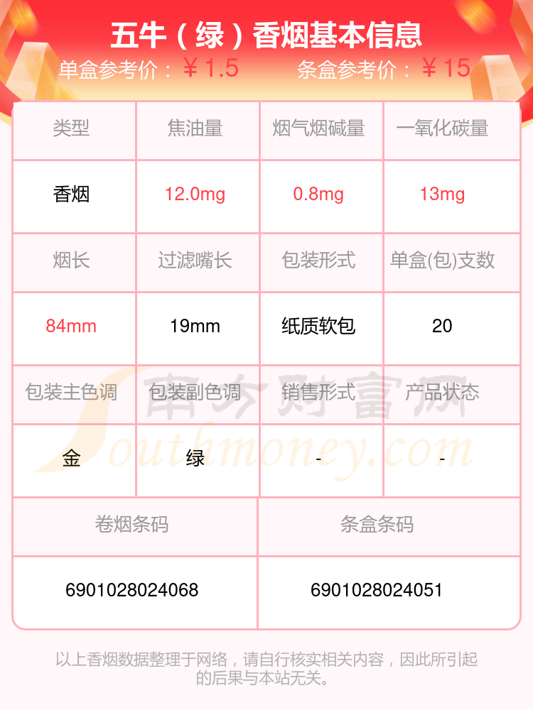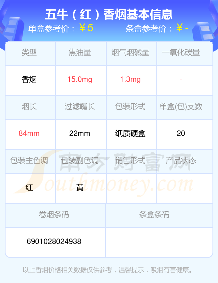五牛(紅)參考價5.0元/包、五牛(硬金)參考價2.5元/包、五牛(綠)參考價1.5元/包、五牛(藍天地)參考價6.0元/包、五牛(硬綠新)參考價3.0元/包等。
