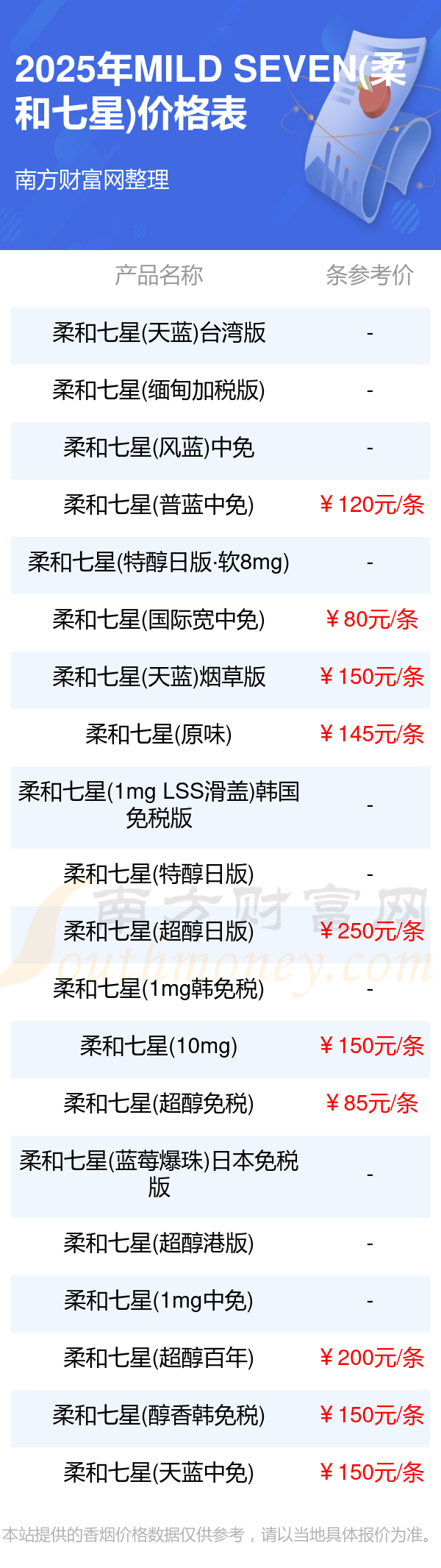 2025MILD SEVEN(柔和七星)香煙最新價(jià)格:柔和七星(超醇日版)參考價(jià)250.0元/條、柔和七星(超醇百年)參考價(jià)200.0元/條、柔和七星(天藍(lán))煙草版參考價(jià)150.0元/條、柔和七星(10mg)參考價(jià)150.0元/條、柔和七星(醇香韓免稅)參考價(jià)150.0元/條、柔和七星(天藍(lán)中免)參考價(jià)150.0元/條、柔和七星(原味)參考價(jià)145.0元/條、柔和七星(普藍(lán)中免)參考價(jià)120.0元/條。