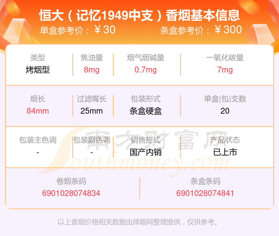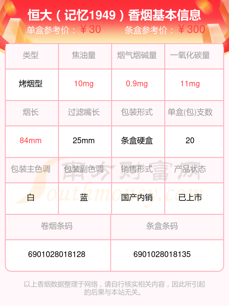 恒大香煙30~40元左右的煙有哪些?擇煙網(wǎng)為大家整理提供,分別有:恒大(記憶1949中支)、恒大(硬中支)、恒大(記憶1949)等,具體價(jià)格如下: