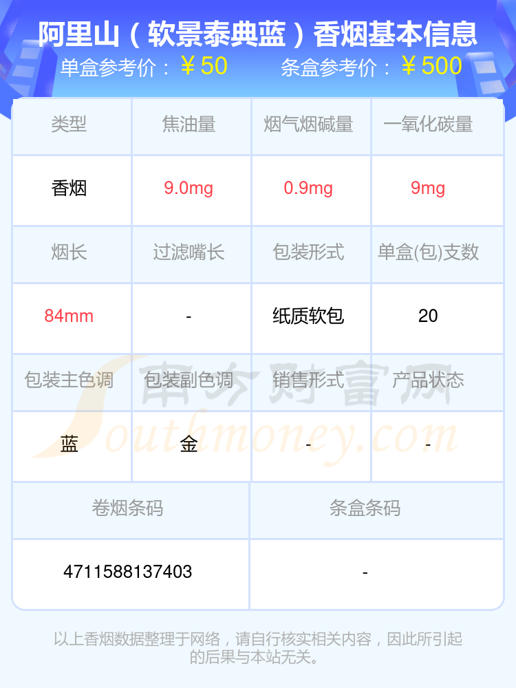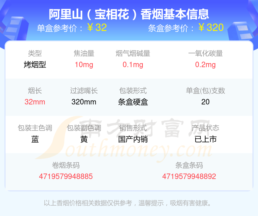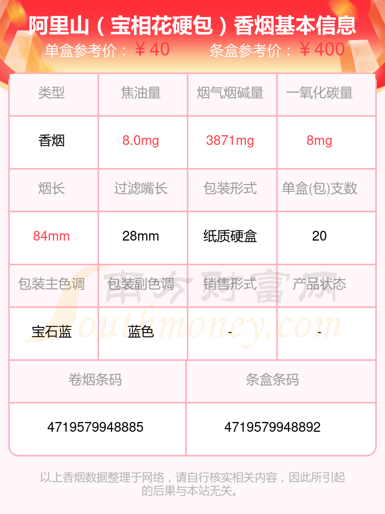 阿里山香煙30元至60元的煙分別有阿里山(軟景泰典藍(lán))參考價(jià)50.0元/包、阿里山(寶相花硬包)參考價(jià)40.0元/包、阿里山(寶相花)參考價(jià)32元/包等。