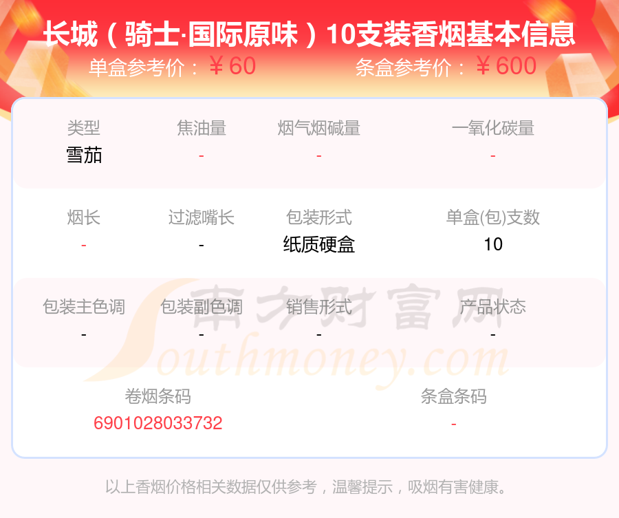 長(zhǎng)城(騎士·國(guó)際原味)10支裝單盒參考價(jià):60元