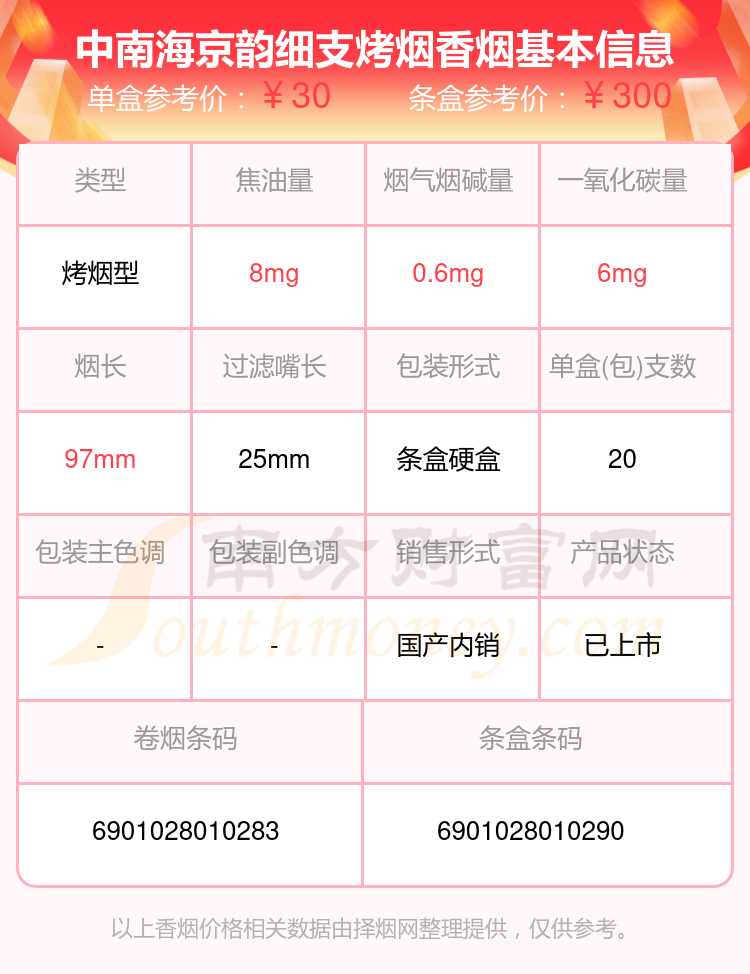 中南海京韻細(xì)支烤煙單盒參考價(jià):30元