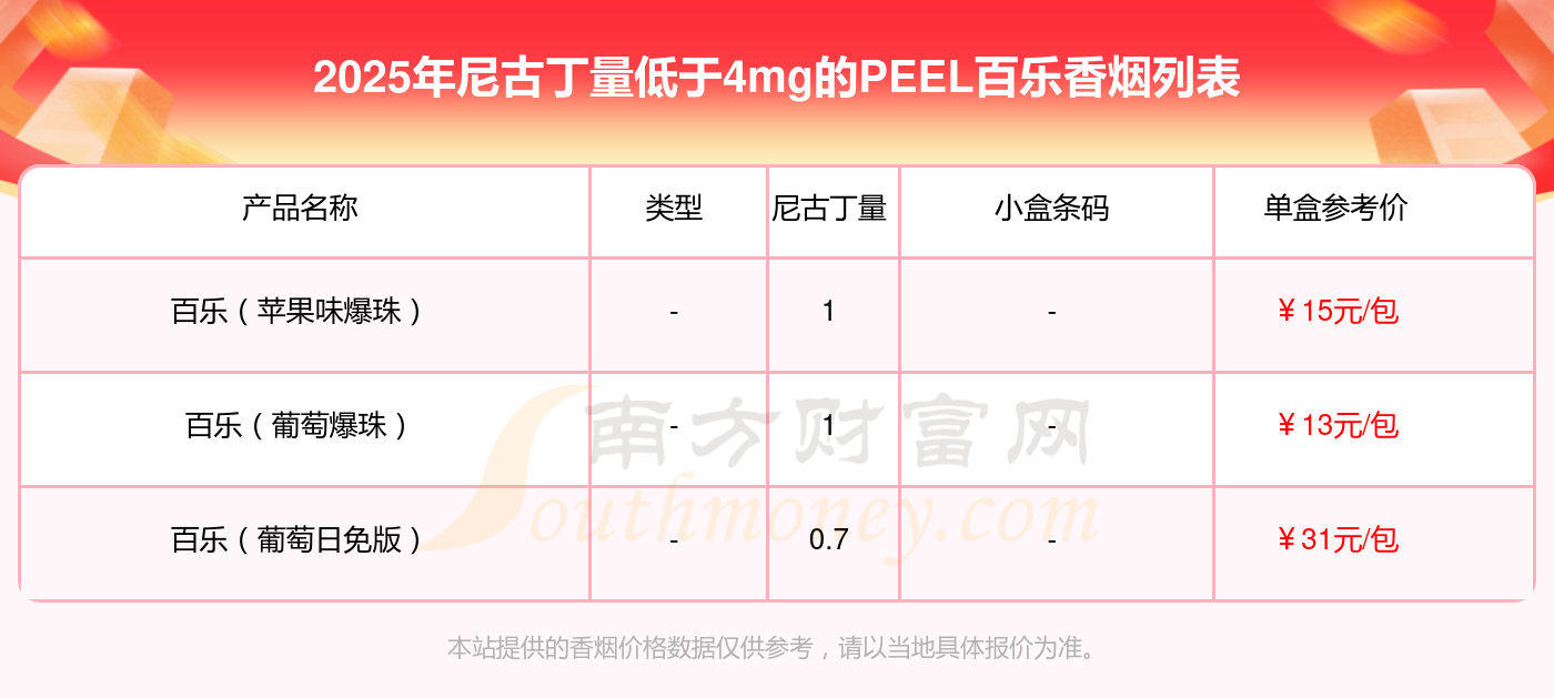 PEEL百樂(lè)香煙尼古丁量低于4mg的煙有哪些?擇煙網(wǎng)為大家整理提供,分別有:百樂(lè)(蘋(píng)果味爆珠)、百樂(lè)(葡萄爆珠)、百樂(lè)(葡萄日免版)等,具體價(jià)格如下: