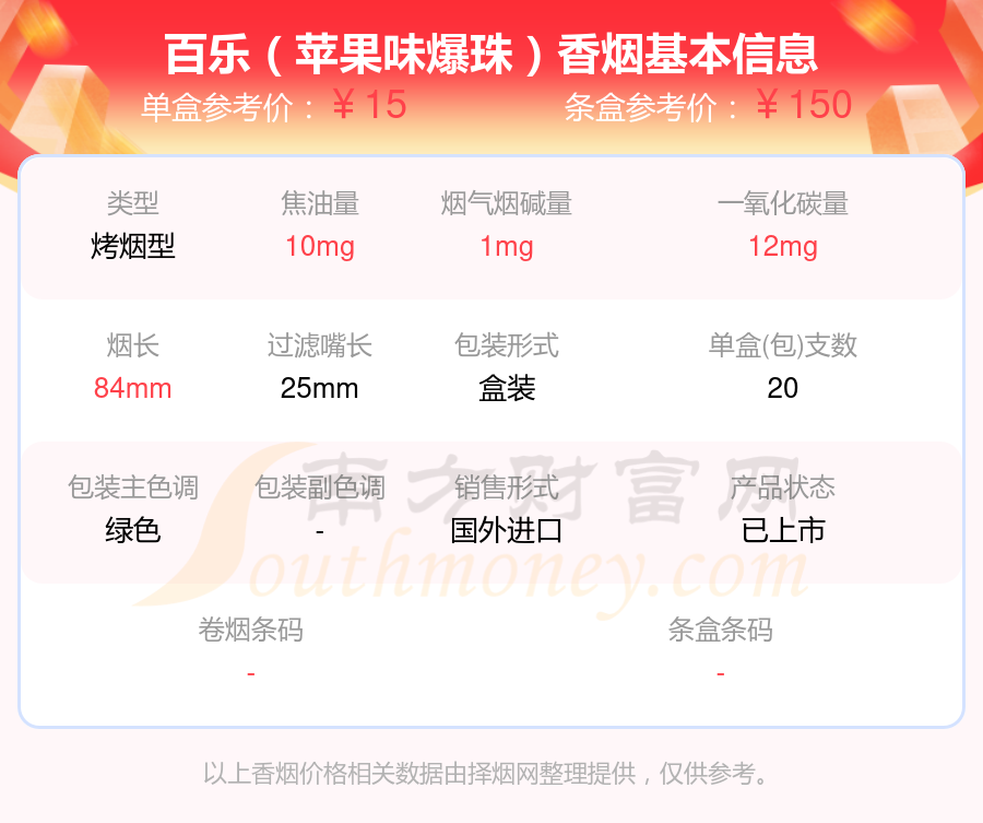 以上香煙數(shù)據(jù)整理于網(wǎng)絡(luò),請(qǐng)自行核實(shí)相關(guān)內(nèi)容,因此所引起的后果與本站無關(guān)。