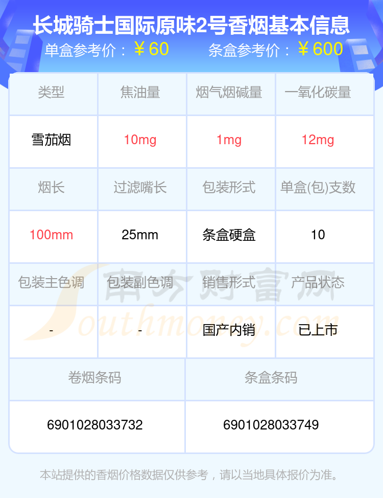 長(zhǎng)城騎士國(guó)際原味2號(hào)單盒參考價(jià):60元