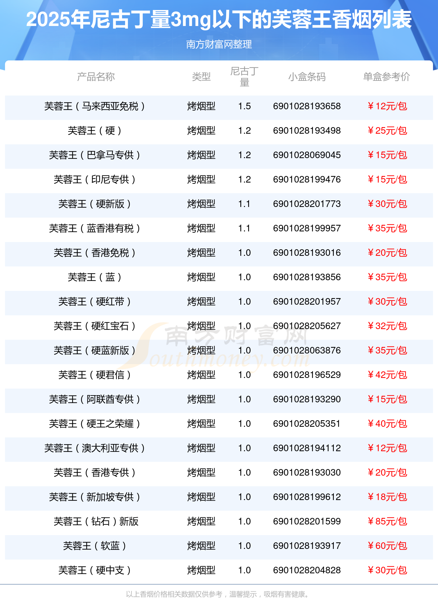 芙蓉王香煙尼古丁量3mg以下的煙有哪些?擇煙網為大家整理提供,分別有:芙蓉王(馬來西亞免稅)、芙蓉王(硬)、芙蓉王(巴拿馬專供)、芙蓉王(印尼專供)、芙蓉王(硬新版)、芙蓉王(藍香港有稅)、芙蓉王(香港免稅)、芙蓉王(藍)、芙蓉王(硬紅帶)、芙蓉王(硬紅寶石)等,具體價格如下:
