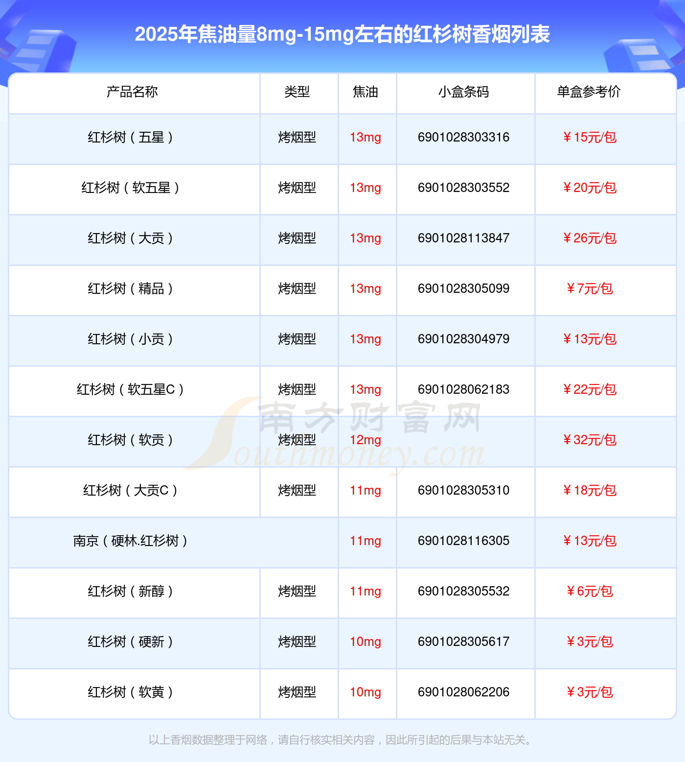 擇煙網(wǎng)為大家盤點(diǎn)了紅杉樹(shù)香煙焦油量8mg-15mg左右的,分別有紅杉樹(shù)(五星)、紅杉樹(shù)(軟五星)、紅杉樹(shù)(大貢)、紅杉樹(shù)(精品)、紅杉樹(shù)(小貢)、紅杉樹(shù)(軟五星C)、紅杉樹(shù)(軟貢)、紅杉樹(shù)(大貢C)、南京(硬林.紅杉樹(shù))、紅杉樹(shù)(新醇)等,具體價(jià)格如下: