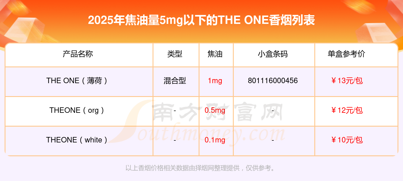 擇煙網(wǎng)為大家盤點(diǎn)了THE ONE香煙焦油量5mg以下的,分別有THE ONE(薄荷)、THEONE(org)、THEONE(white)等,詳細(xì)價(jià)格如下: