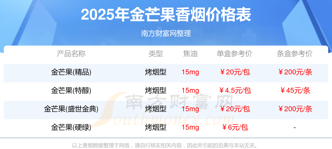 2025年,金芒果(精品)、金芒果(盛世金典)、金芒果(硬綠)、金芒果(特醇)等金芒果香煙價格如下:金芒果(精品)參考價20.0元/包、金芒果(盛世金典)參考價20.0元/包、金芒果(硬綠)參考價6.0元/包、金芒果(特醇)參考價4.5元/包。