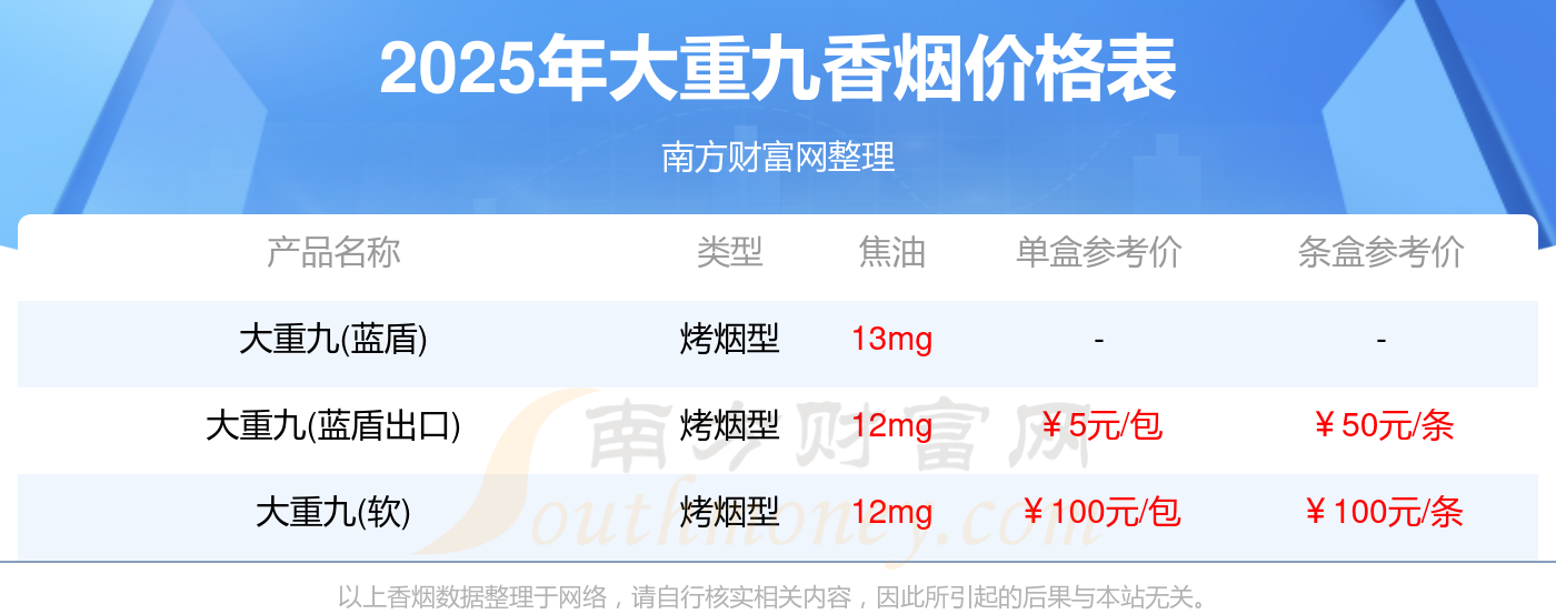 2025年大重九香煙大重九(軟)、大重九(藍(lán)盾出口)等最新價(jià)格如下: