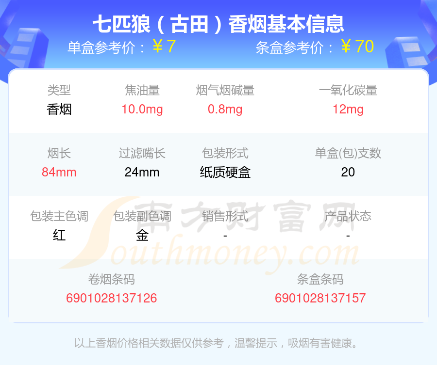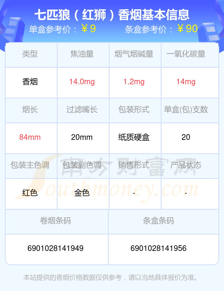 擇煙網(wǎng)為大家盤點(diǎn)了10元以下的七匹狼香煙,有七匹狼(紅獅)、七匹狼(藍(lán))、七匹狼(金)、七匹狼(豪情)、七匹狼(白)、七匹狼(白金)、七匹狼(古田)、七匹狼(棗紅新)、七匹狼(豪運(yùn))、七匹狼(硬大富貴)等,詳細(xì)價格如下: