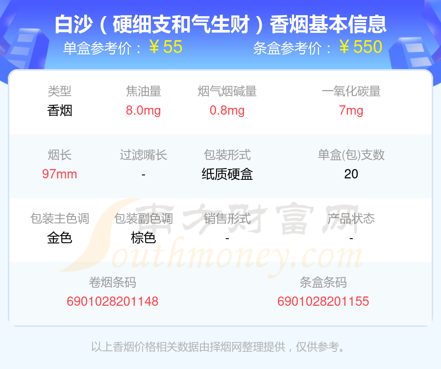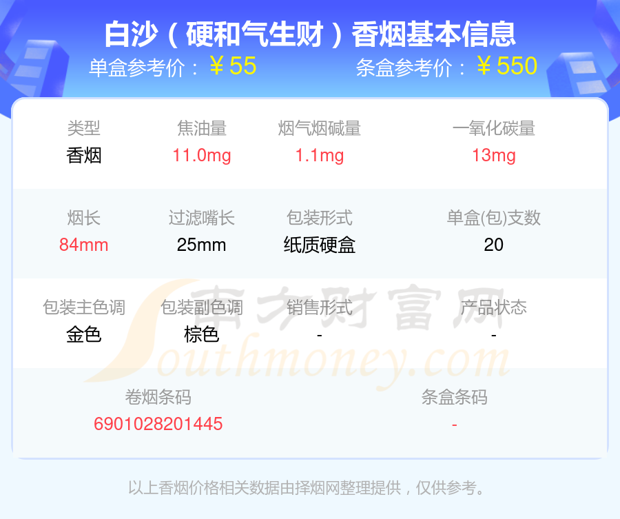 擇煙網(wǎng)為大家盤點了白沙香煙50-70元的,分別有白沙(和鉆石)、白沙(硬細支和氣生財)、白沙(硬和氣生財)等,詳細價格如下: