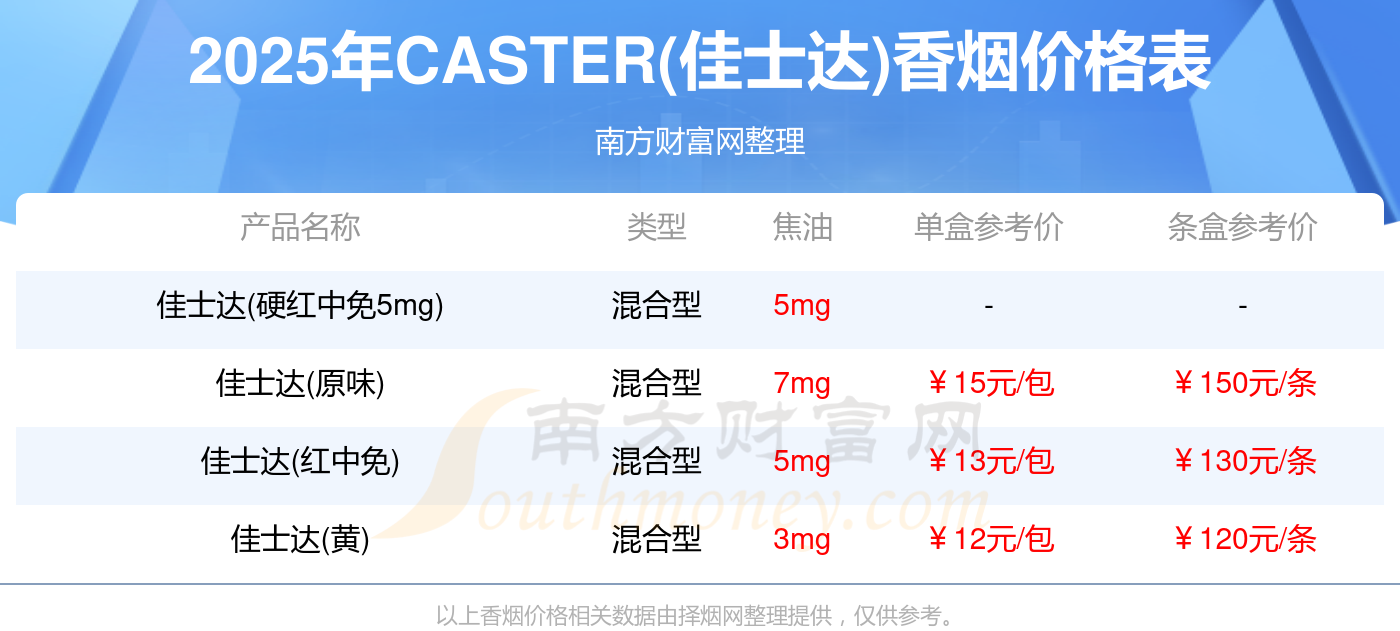 2025年CASTER(佳士達(dá))價(jià)格最高的香煙是佳士達(dá)(原味),參考價(jià)15.0元/包,最低的是佳士達(dá)(黃),參考價(jià)12.0元/包,價(jià)格高低差為3元/包。