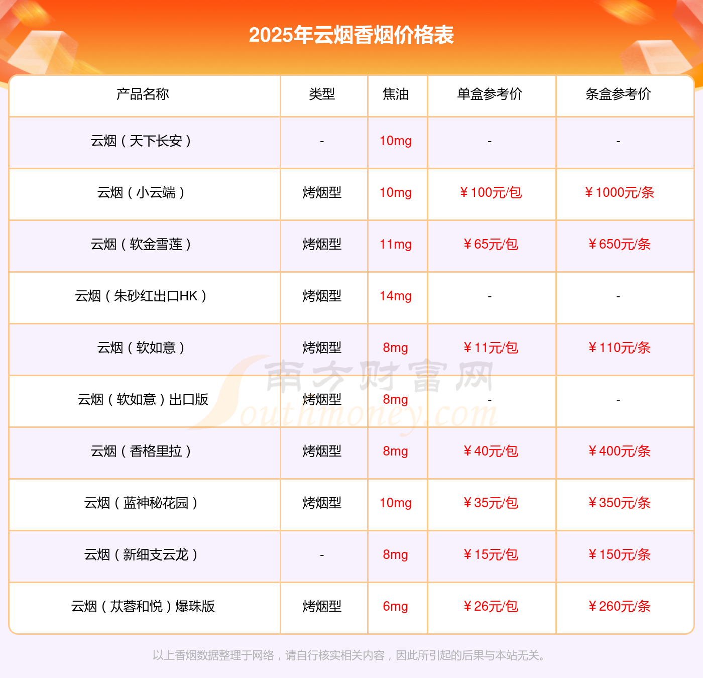 以上香煙數(shù)據(jù)整理于網(wǎng)絡(luò),請(qǐng)自行核實(shí)相關(guān)內(nèi)容,因此所引起的后果與本站無(wú)關(guān)。