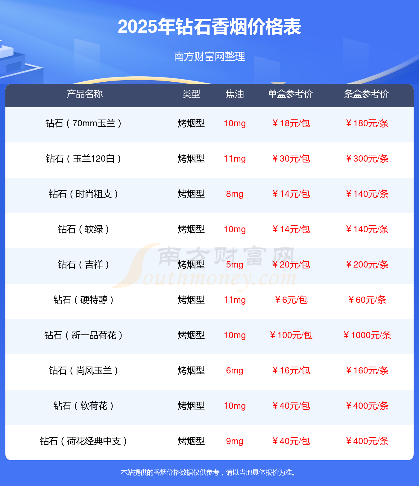 鉆石品牌其他香煙價(jià)格表