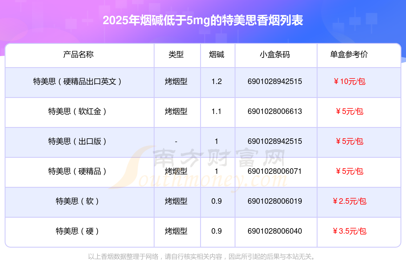 特美思香煙煙堿低于5mg的煙有特美思(硬精品出口英文)、特美思(軟紅金)、特美思(出口版)、特美思(硬精品)、特美思(軟)、特美思(硬)等,具體價(jià)格如下:
