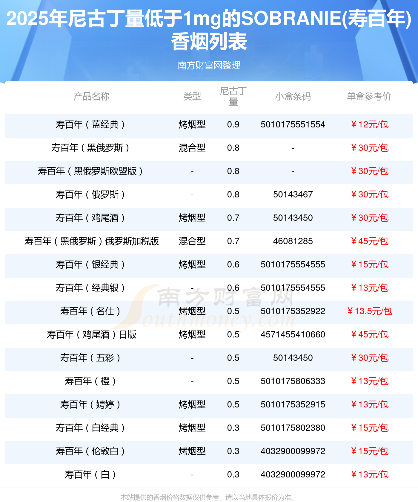 擇煙網(wǎng)為大家盤點了SOBRANIE(壽百年)香煙尼古丁量低于1mg的,分別有壽百年(藍經(jīng)典)、壽百年(黑俄羅斯)、壽百年(黑俄羅斯歐盟版)、壽百年(俄羅斯)、壽百年(雞尾酒)、壽百年(黑俄羅斯)俄羅斯加稅版、壽百年(銀經(jīng)典)、壽百年(經(jīng)典銀)、壽百年(名仕)、壽百年(雞尾酒)日版等,詳細價格如下: