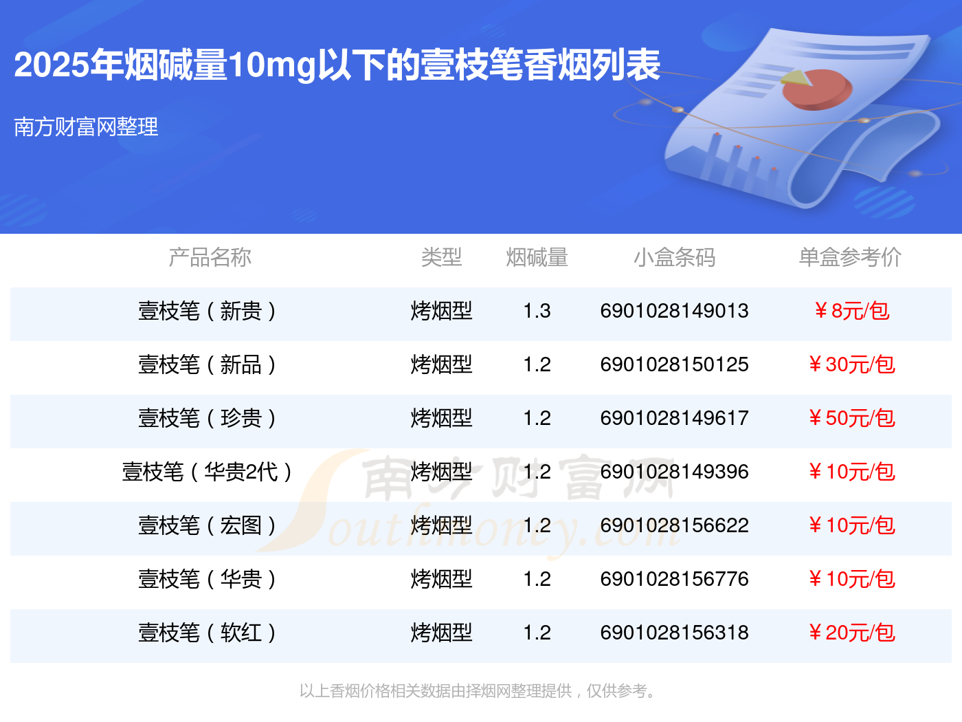 擇煙網(wǎng)為大家盤點了壹枝筆香煙煙堿量10mg以下的,分別有壹枝筆(新貴)、壹枝筆(新品)、壹枝筆(珍貴)、壹枝筆(華貴2代)、壹枝筆(宏圖)、壹枝筆(華貴)、壹枝筆(軟紅)等,具體價格如下: