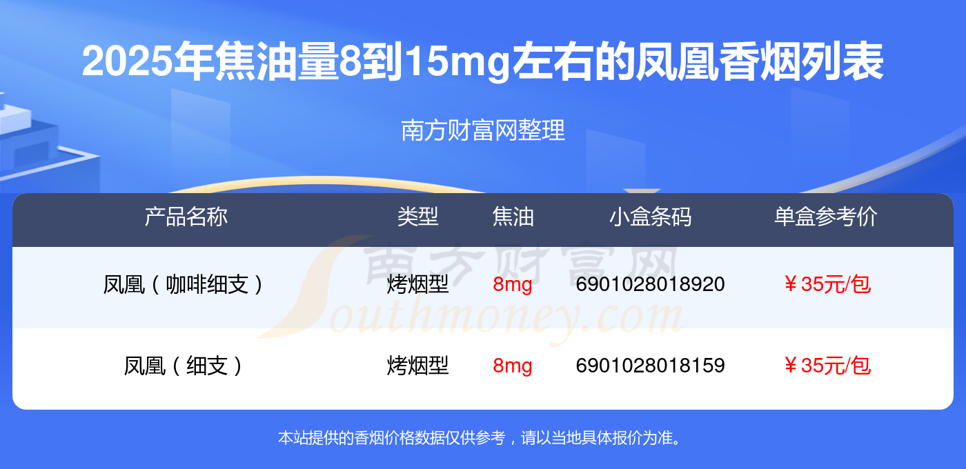 2025年焦油量8到15mg左右的鳳凰香煙一覽表