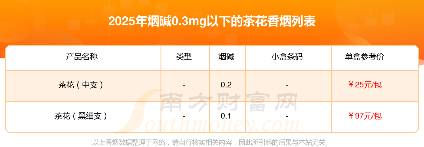煙堿0.3mg以下的茶花香煙有哪些?擇煙網(wǎng)為大家整理盤點,有茶花(中支)、茶花(黑細(xì)支)等,詳細(xì)價格如下: