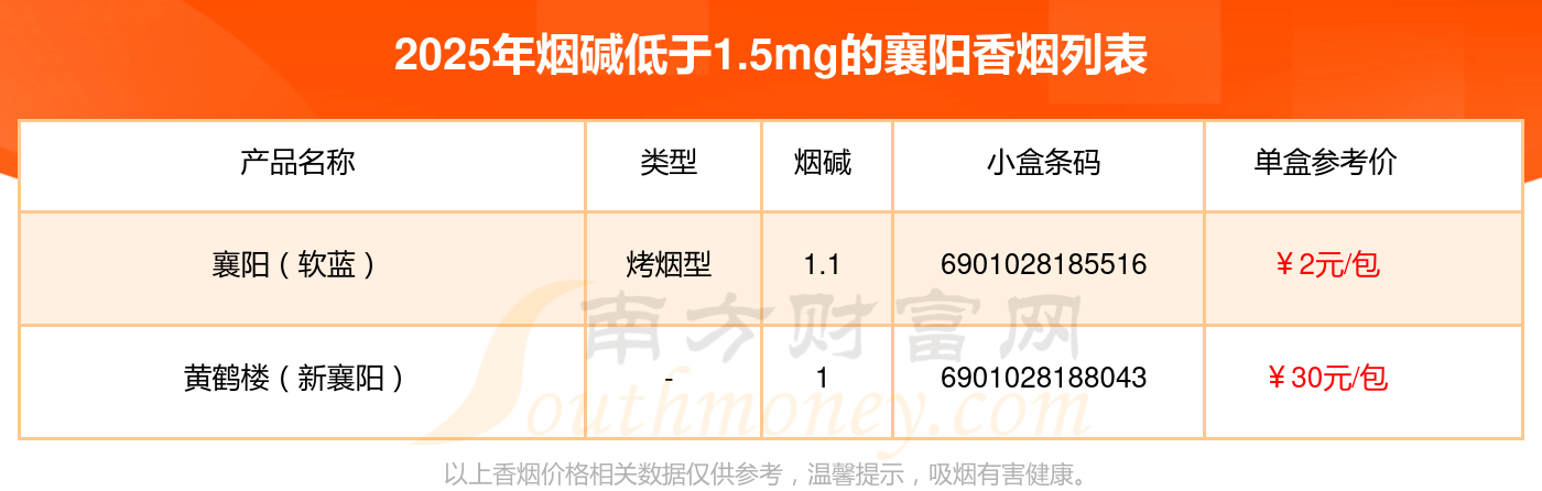 襄陽香煙煙堿低于1.5mg的煙有哪些?擇煙網(wǎng)為大家整理提供,分別有:襄陽(軟藍(lán))、黃鶴樓(新襄陽)等,具體價(jià)格如下: