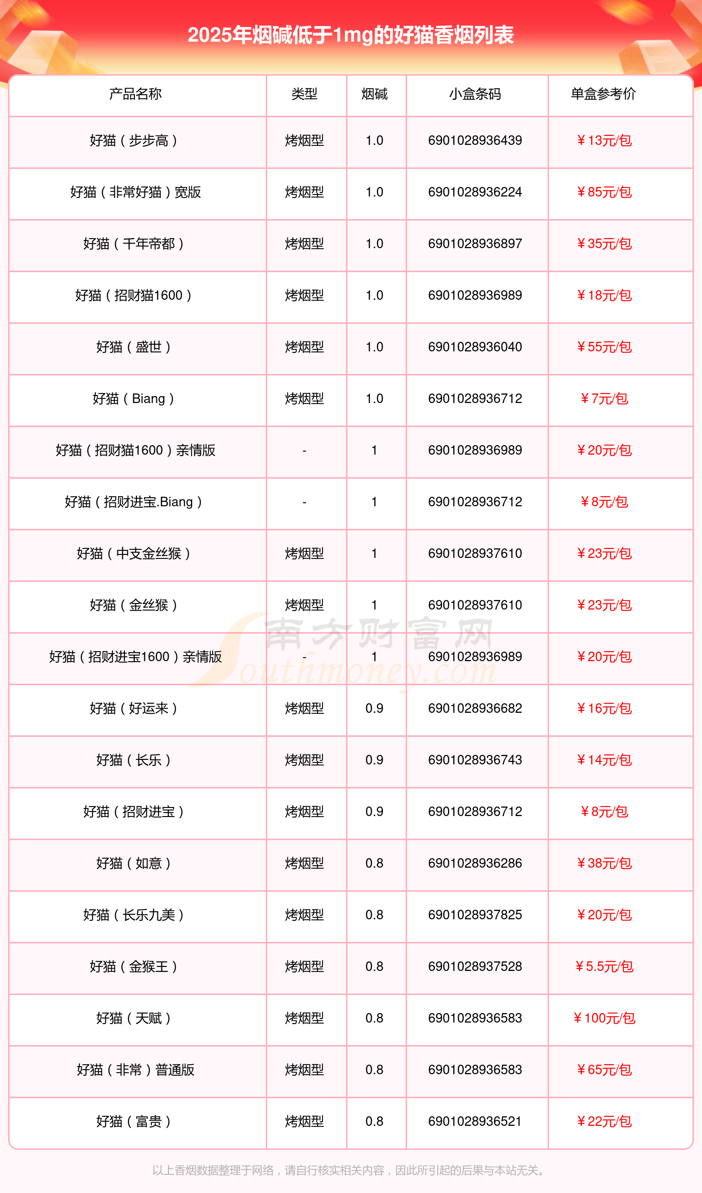 好貓香煙煙堿低于1mg的煙有哪些?擇煙網(wǎng)為大家整理提供,分別有:好貓(步步高)、好貓(非常好貓)寬版、好貓(千年帝都)、好貓(招財(cái)貓1600)、好貓(盛世)、好貓(Biang)、好貓(招財(cái)貓1600)親情版、好貓(招財(cái)進(jìn)寶.Biang)、好貓(中支金絲猴)、好貓(金絲猴)等,具體價(jià)格如下: