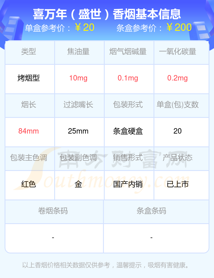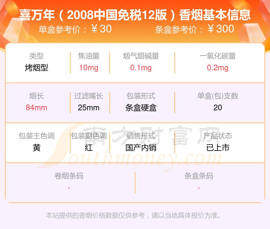 喜萬(wàn)年香煙尼古丁量0.3mg以下的煙有哪些?擇煙網(wǎng)為大家整理提供,分別有:喜萬(wàn)年(2008中國(guó)免稅12版)、喜萬(wàn)年(盛世)等,具體價(jià)格如下:
