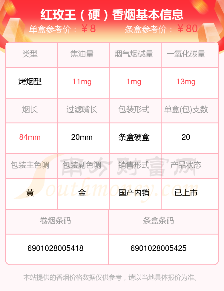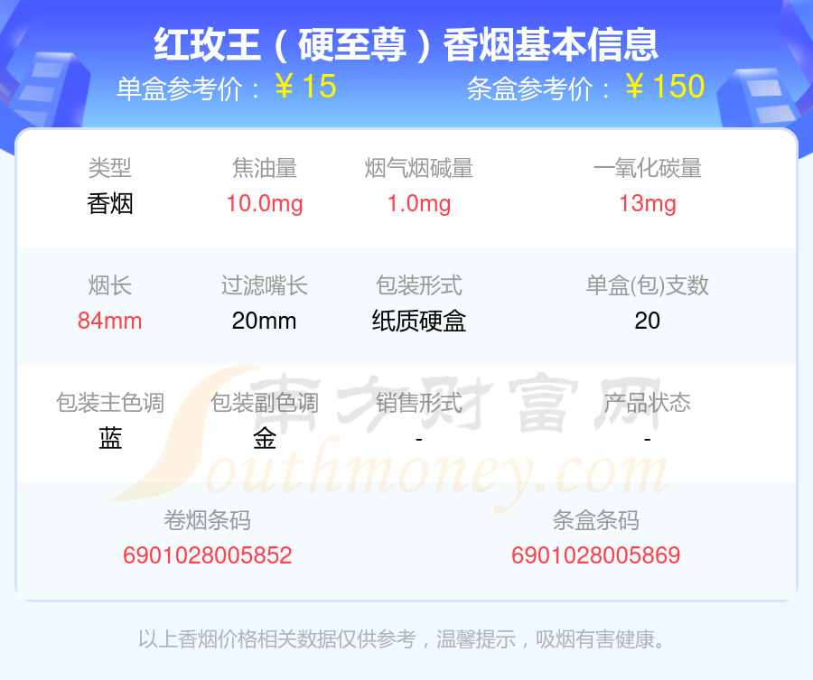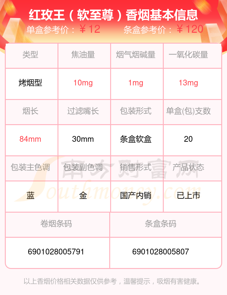煙堿量4mg以下的紅玫王香煙有哪些?擇煙網(wǎng)為大家整理盤點(diǎn),有紅玫王(硬至尊)、紅玫王(硬)、紅玫王(硬藍(lán))、紅玫王(軟至尊)等,詳細(xì)價(jià)格如下: