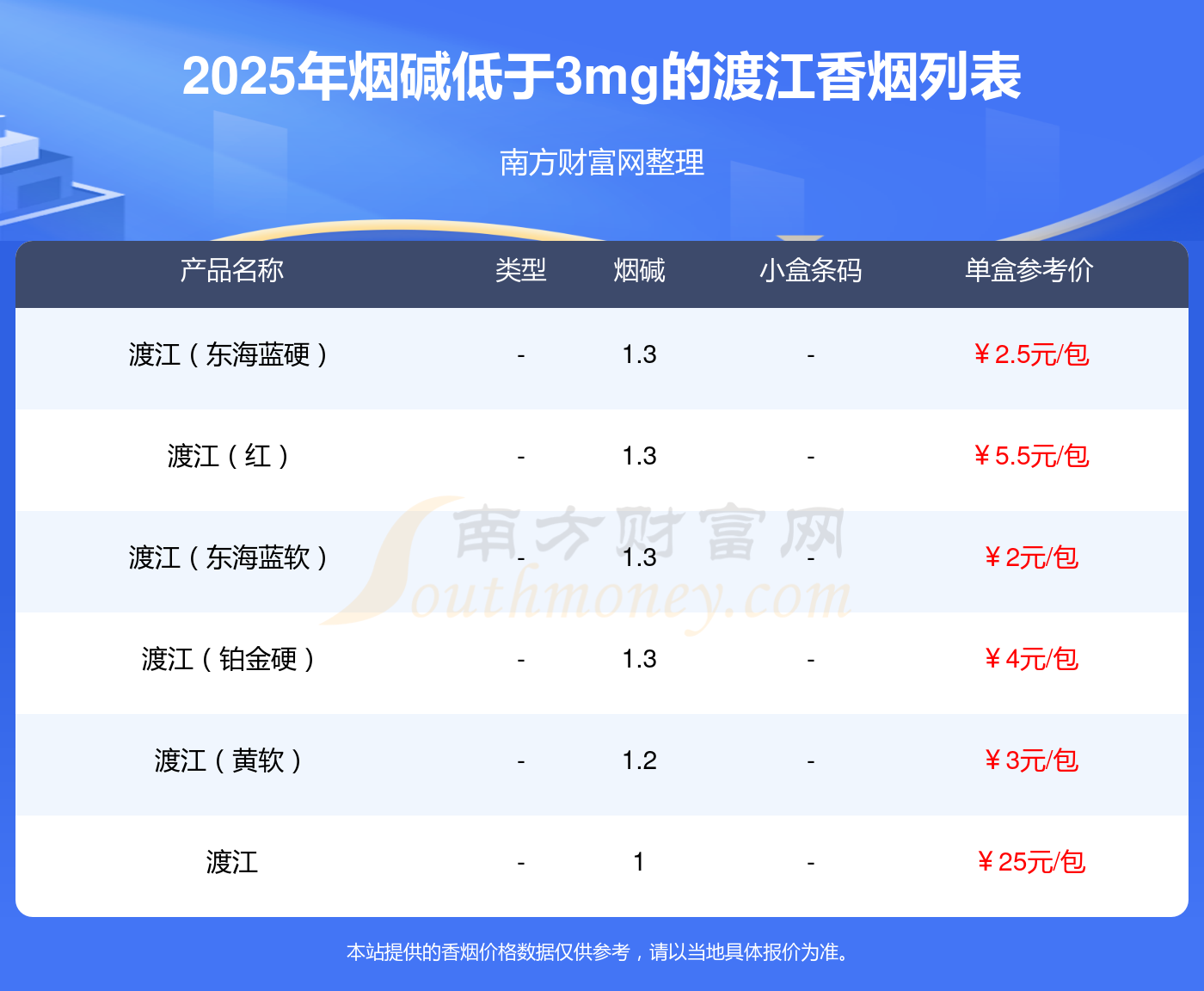 渡江香煙煙堿低于3mg的煙有渡江(東海藍(lán)硬)、渡江(紅)、渡江(東海藍(lán)軟)、渡江(鉑金硬)、渡江(黃軟)、渡江等,具體價(jià)格如下:
