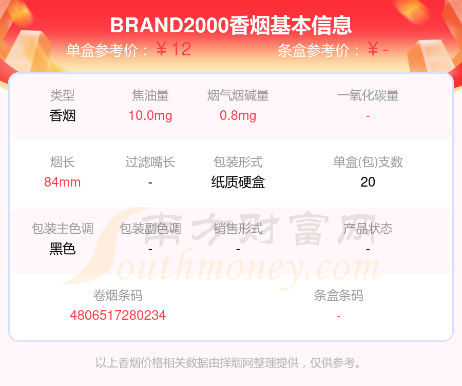 擇煙網(wǎng)為大家盤點(diǎn)了煙堿量4mg以下的BRAND2000香煙,有BRAND2000、BRAND2000等,詳細(xì)價(jià)格如下: