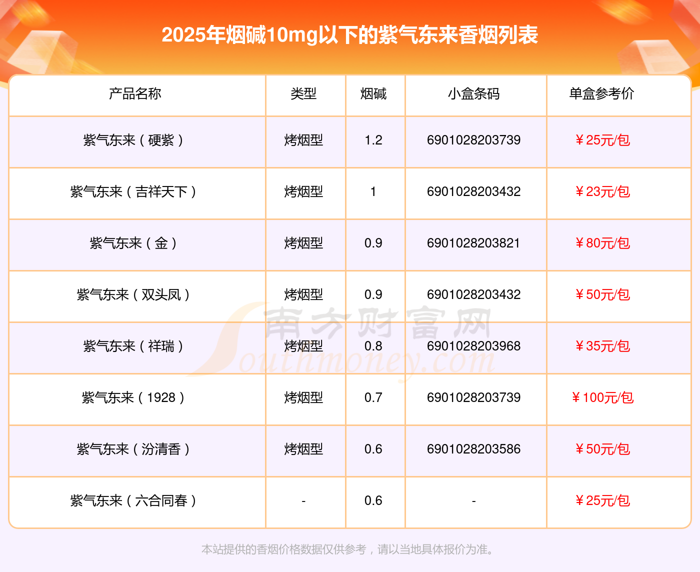 擇煙網(wǎng)為大家盤(pán)點(diǎn)了紫氣東來(lái)香煙煙堿10mg以下的煙,有以下這些:
