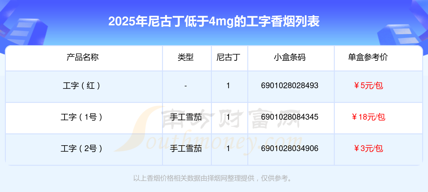尼古丁低于4mg的工字香煙有哪些?擇煙網(wǎng)為大家整理盤點(diǎn),分別有:工字(紅)、工字(1號(hào))、工字(2號(hào))等,具體價(jià)格如下: