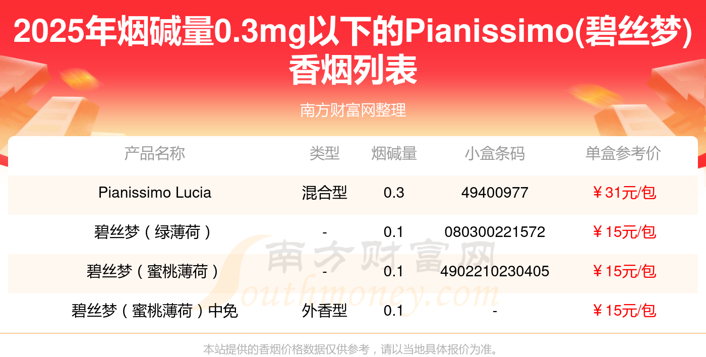 擇煙網(wǎng)為大家盤點了Pianissimo(碧絲夢)香煙煙堿量0.3mg以下的,分別有Pianissimo Lucia、碧絲夢(綠薄荷)、碧絲夢(蜜桃薄荷)、碧絲夢(蜜桃薄荷)中免等,具體價格如下: