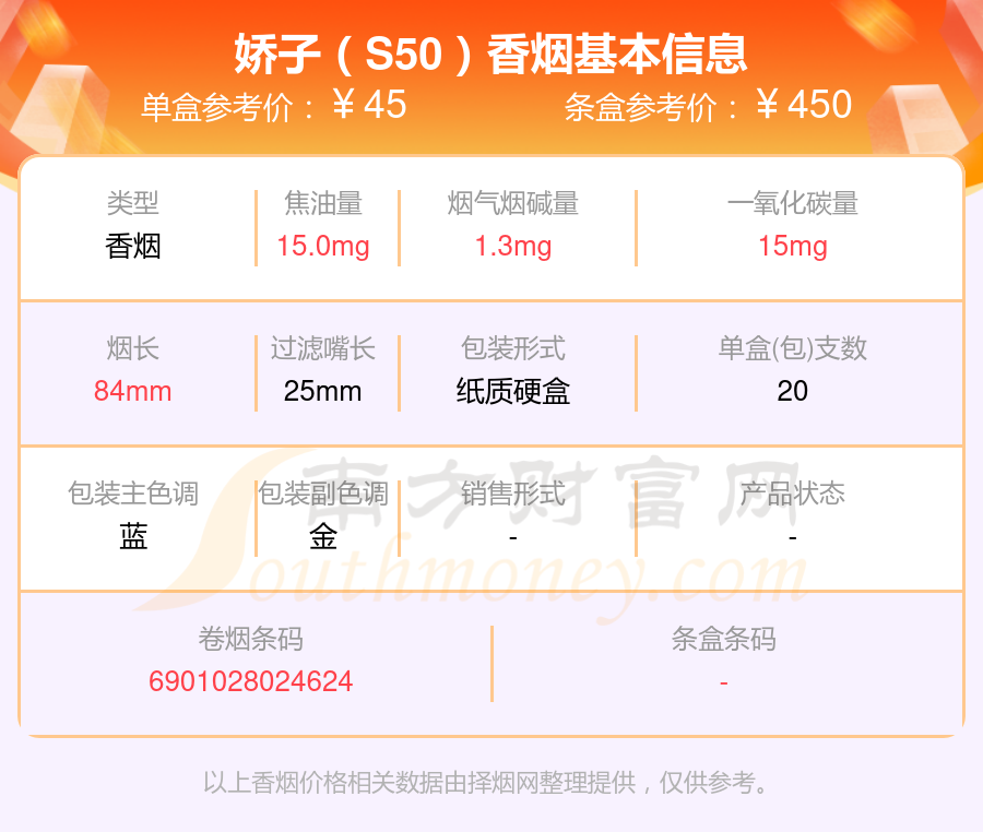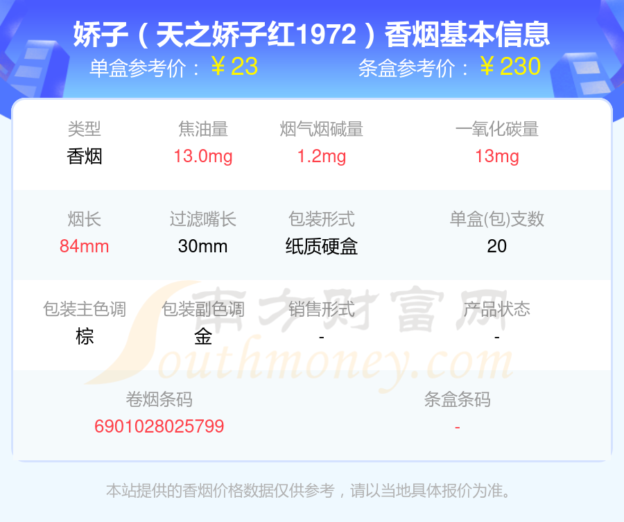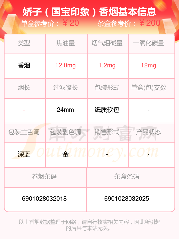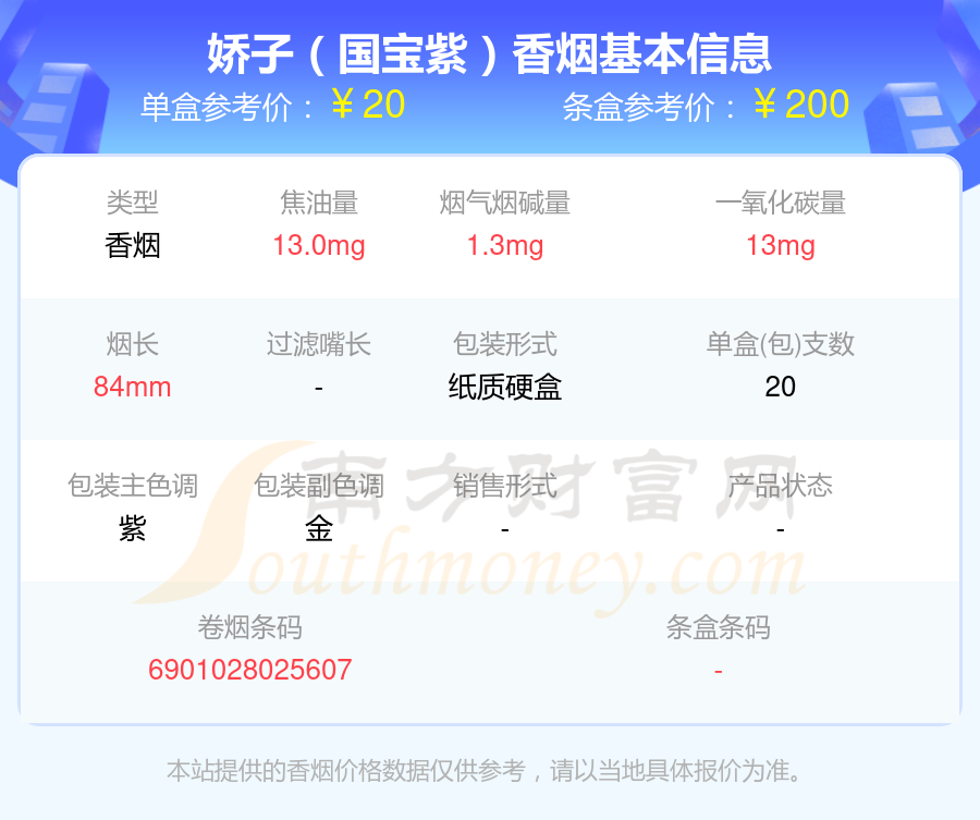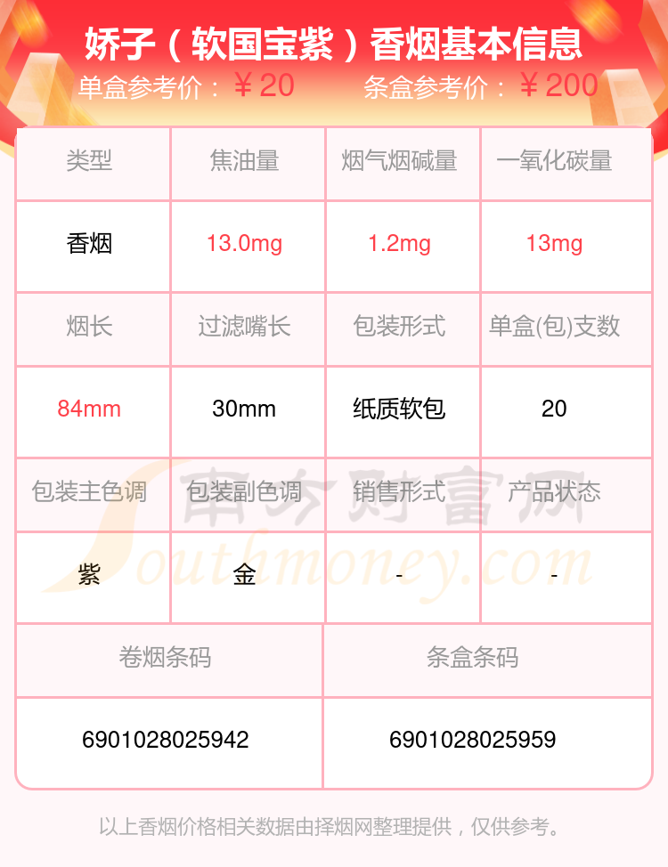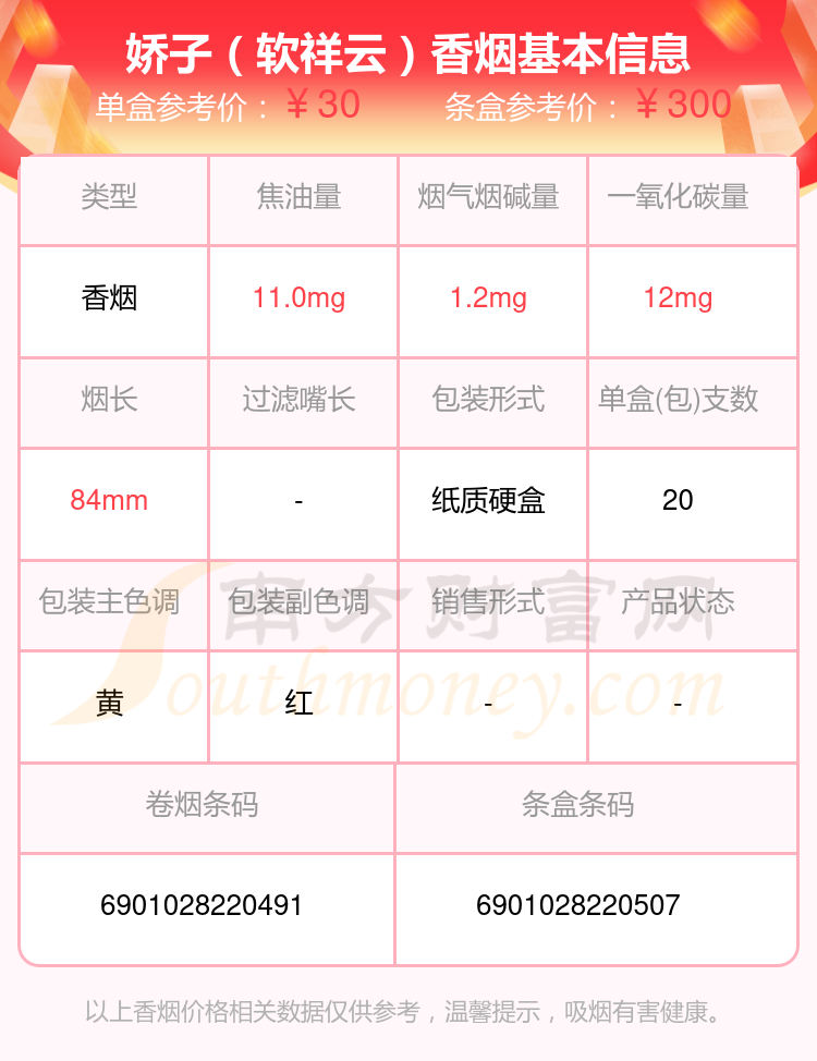 嬌子香煙煙堿3mg以下的煙有哪些?擇煙網(wǎng)為大家整理提供,分別有:嬌子(國寶紫)、嬌子(S50)、嬌子(軟龍鳳呈祥)、嬌子(天之嬌子紅)、嬌子(軟國寶紫)、嬌子(硬龍鳳呈祥)、嬌子(國寶印象)、嬌子(天之嬌子紅1972)、嬌子(國寶)、嬌子(軟祥云)等,具體價(jià)格如下: