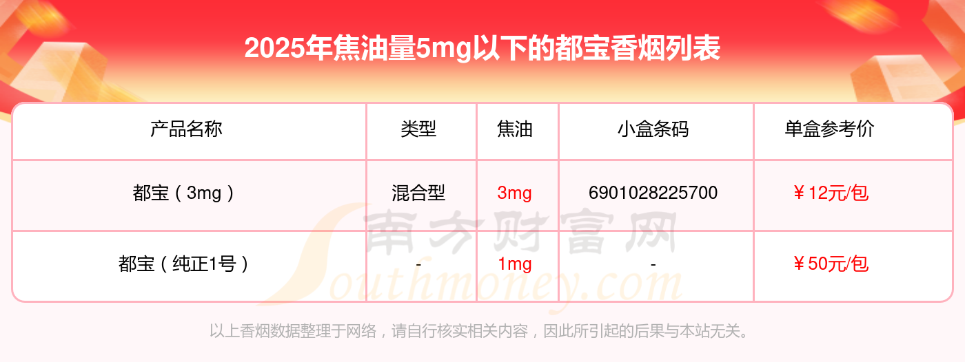 擇煙網為大家盤點了都寶香煙焦油量5mg以下的,分別有都寶(3mg)、都寶(純正1號)等,詳細價格如下: