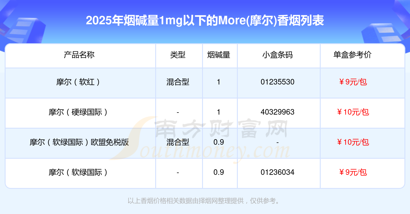 煙堿量1mg以下的More(摩爾)香煙有哪些?擇煙網(wǎng)為大家整理盤點,有摩爾(軟紅)、摩爾(硬綠國際)、摩爾(軟綠國際)歐盟免稅版、摩爾(軟綠國際)等,詳細價格如下: