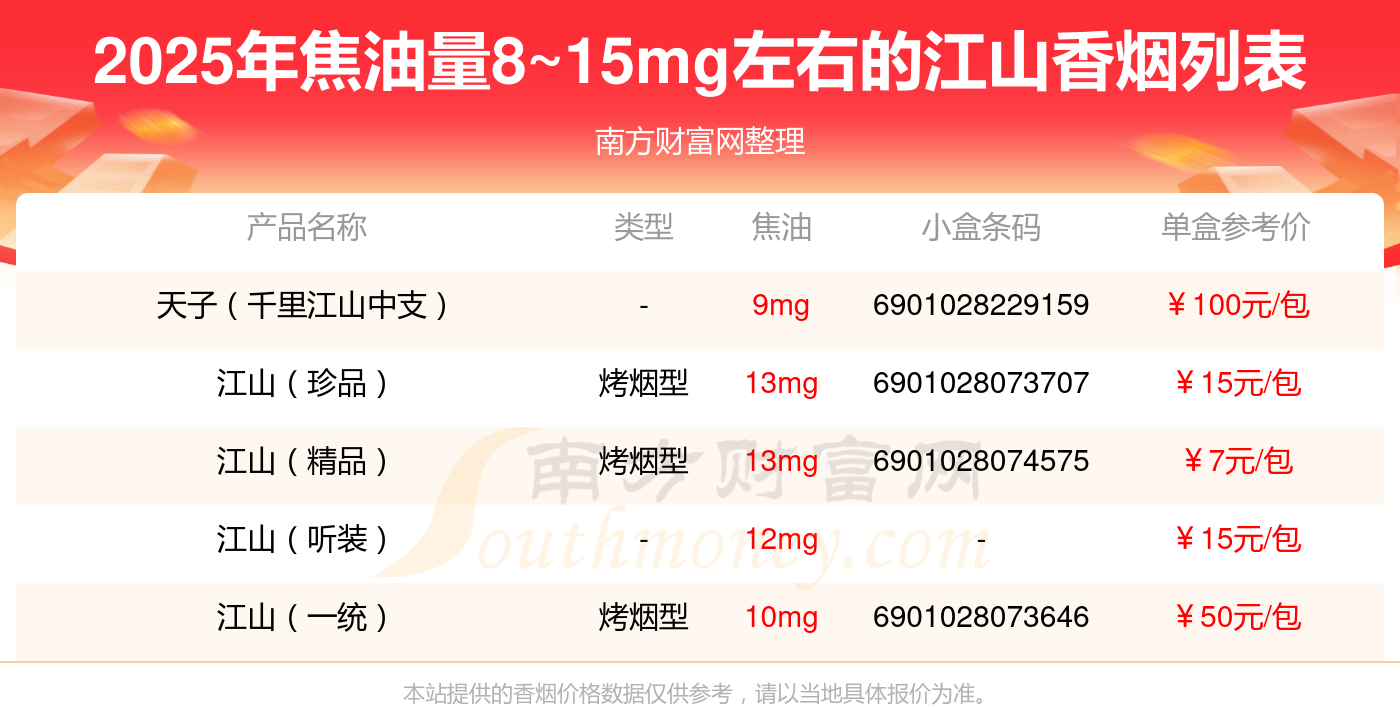 擇煙網(wǎng)為大家盤點了焦油量8~15mg左右的江山香煙,有天子(千里江山中支)、江山(珍品)、江山(精品)、江山(聽裝)、江山(一統(tǒng))等,詳細價格如下: