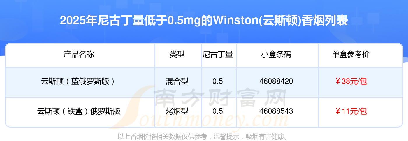 擇煙網(wǎng)為大家盤點(diǎn)了Winston(云斯頓)香煙尼古丁量低于0.5mg的,分別有云斯頓(藍(lán)俄羅斯版)、云斯頓(鐵盒)俄羅斯版等,具體價格如下: