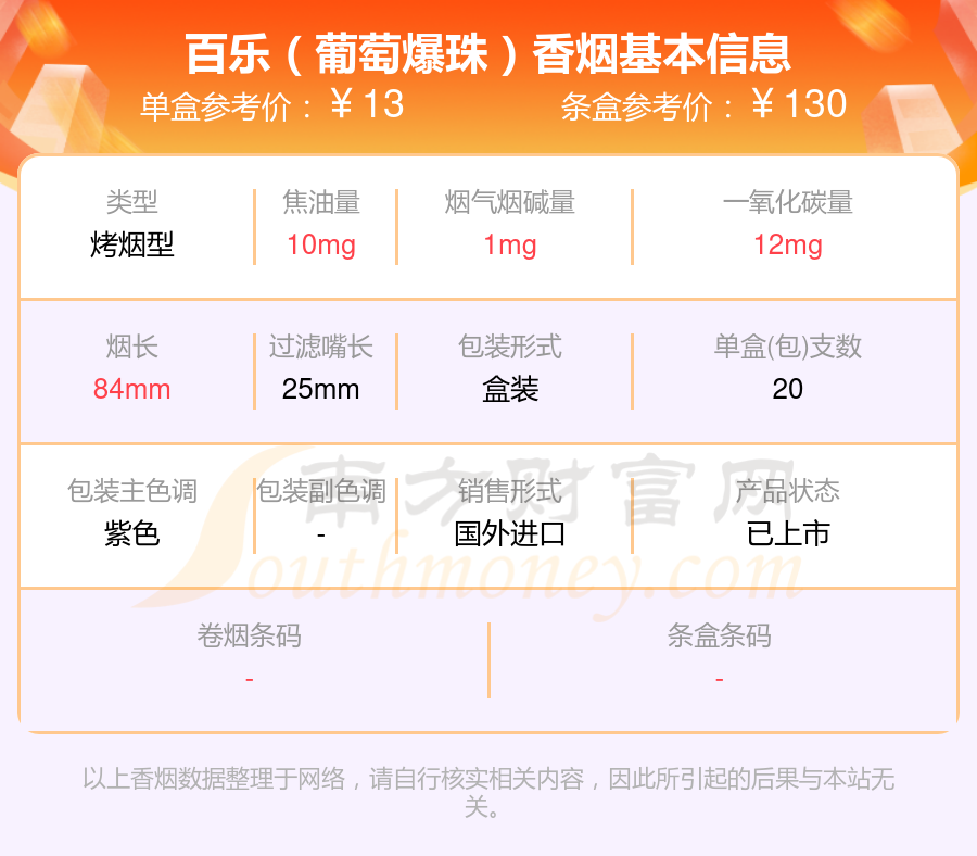 以上香煙數據整理于網絡,請自行核實相關內容,因此所引起的后果與本站無關。
