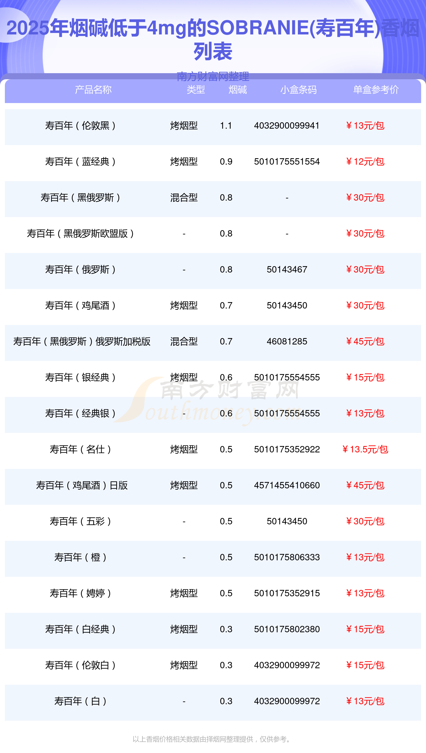擇煙網(wǎng)為大家盤點了SOBRANIE(壽百年)香煙煙堿低于4mg的,分別有壽百年(倫敦黑)、壽百年(藍(lán)經(jīng)典)、壽百年(黑俄羅斯)、壽百年(黑俄羅斯歐盟版)、壽百年(俄羅斯)、壽百年(雞尾酒)、壽百年(黑俄羅斯)俄羅斯加稅版、壽百年(銀經(jīng)典)、壽百年(經(jīng)典銀)、壽百年(名仕)等,具體價格如下:
