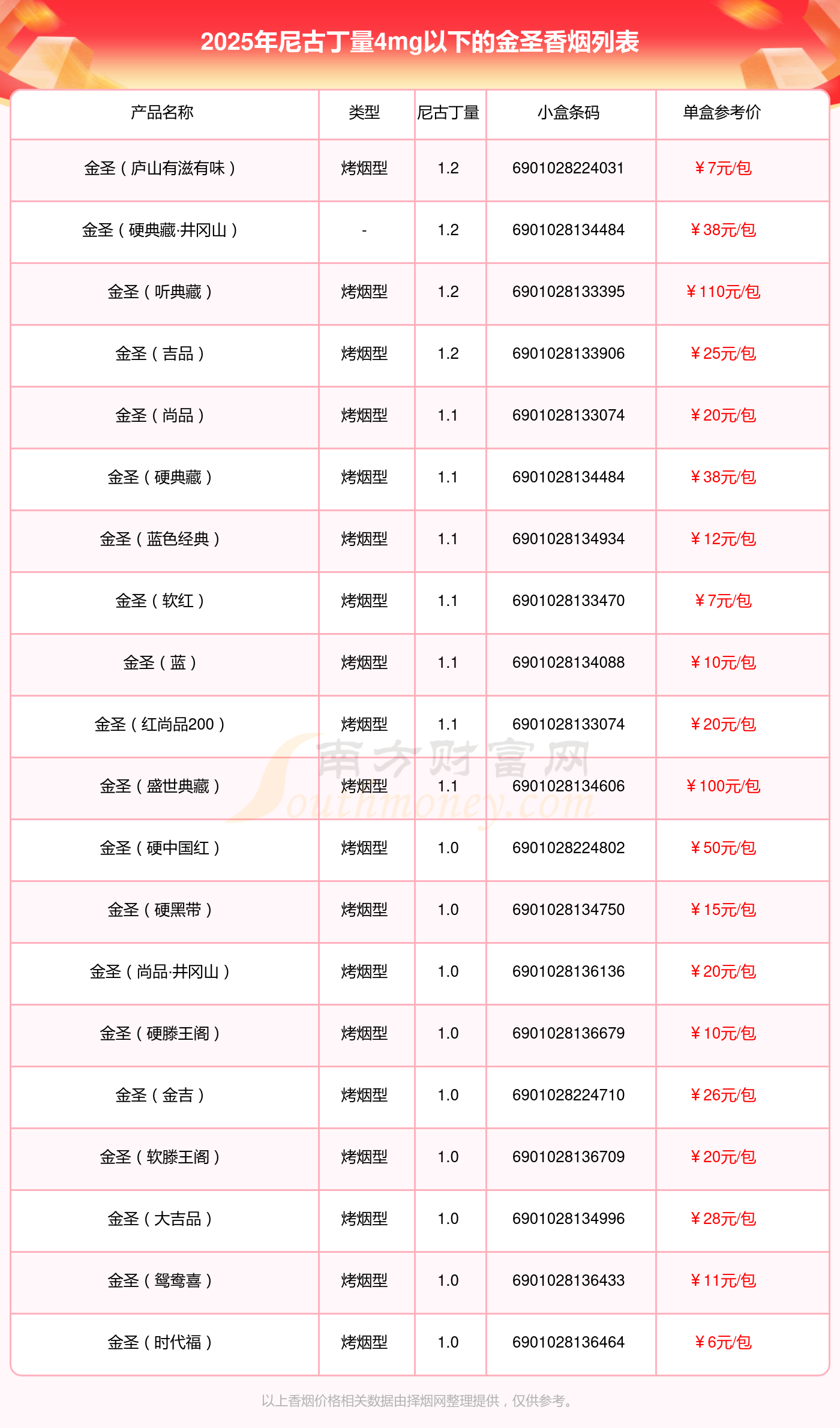 擇煙網(wǎng)為大家盤點了金圣香煙尼古丁量4mg以下的,分別有金圣(廬山有滋有味)、金圣(硬典藏·井岡山)、金圣(聽典藏)、金圣(吉品)、金圣(尚品)、金圣(硬典藏)、金圣(藍色經(jīng)典)、金圣(軟紅)、金圣(藍)、金圣(紅尚品200)等,具體價格如下: