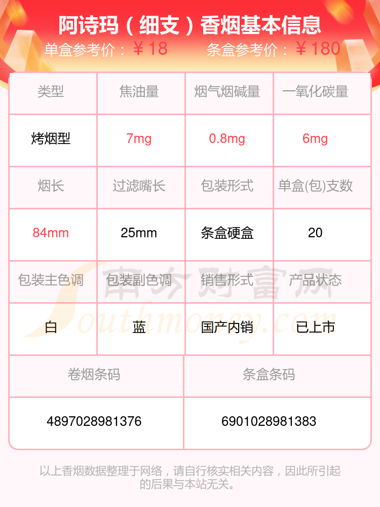 煙堿量低于1mg的阿詩瑪香煙有哪些?擇煙網(wǎng)為大家整理盤點,有阿詩瑪(世紀(jì)經(jīng)典)、阿詩瑪(金)、阿詩瑪(硬金)、阿詩瑪(92MM驚鴻寬版)、阿詩瑪(驚鴻寬版92MM)、阿詩瑪(硬94mmCH)、阿詩瑪(細(xì)支)、阿詩瑪(細(xì))等,詳細(xì)價格如下: