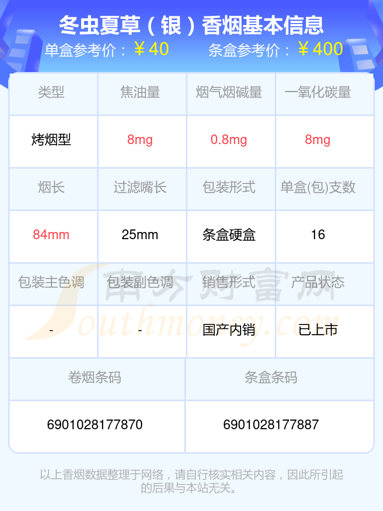 焦油量10mg以下的冬蟲夏草香煙有哪些?擇煙網(wǎng)為大家整理盤點,分別有:冬蟲夏草(銀)、冬蟲夏草(金)、冬蟲夏草(銀)、冬蟲夏草(紅中支)、冬蟲夏草(雙中支)、冬蟲夏草(和潤)、冬蟲夏草(1248)、冬蟲夏草(黃金盛世)、冬蟲夏草(中支和潤)、冬蟲夏草(金細)等,具體價格如下:
