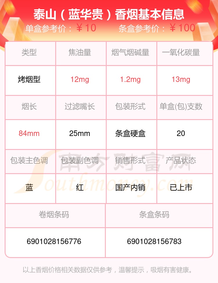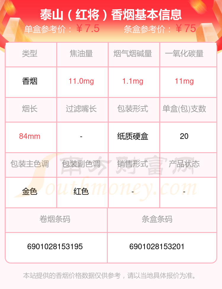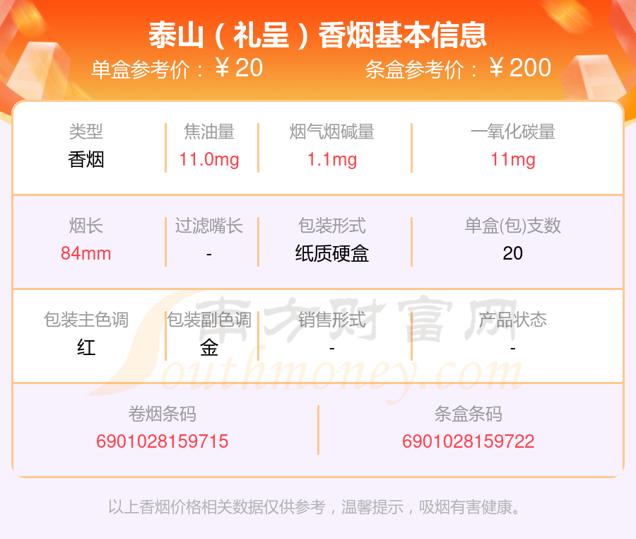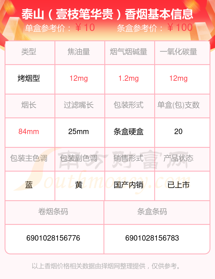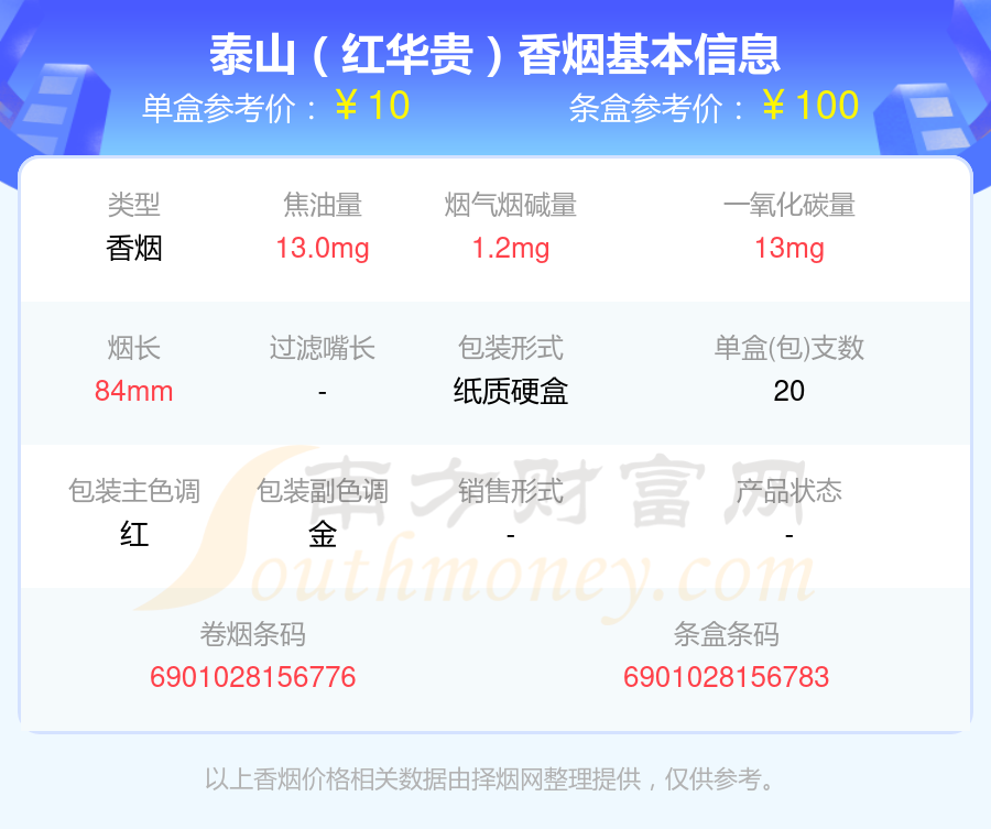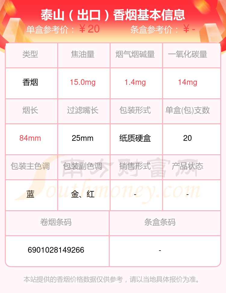 泰山(出口)參考價(jià)20.0元/包、泰山(華貴)參考價(jià)10.0元/包、泰山(紅華貴)參考價(jià)10.0元/包、泰山(拂光)參考價(jià)100.0元/包、泰山(佛光)參考價(jià)100元/包、泰山(藍(lán)華貴)參考價(jià)10元/包、泰山(壹枝筆華貴)參考價(jià)10元/包、泰山(禮呈)參考價(jià)20.0元/包、泰山(紅將)參考價(jià)7.5元/包、泰山(石敢當(dāng))參考價(jià)20.0元/包等。